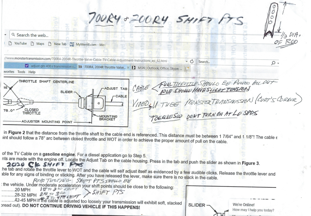 Hello, I have a GM 200R hooked to a Twin H on my '37 Hudson. I fabricated a short bracket to the rear throttle lever to ensure the cable geometry was out max at full throttle. Adjustment is critical so not destroy the Tranny. I had cable all out with linkage floored. I also adjusted with shift points specs at specific MPH but I need to look at it again to advise further. I think the Spes/Shift pts Instruction is in my car. I will look Sat.