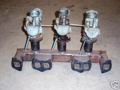 The following pictures are of a 56 or 57 Hudson cut down to run circle track, (at present can not find the pictures of the full car body)  that has a 308 installed with a triple carb set up.  Last is a picture of a manifold made from cut Hudson manifold and square tubing.  Might be one of Chuck's "manufactured manifolds?