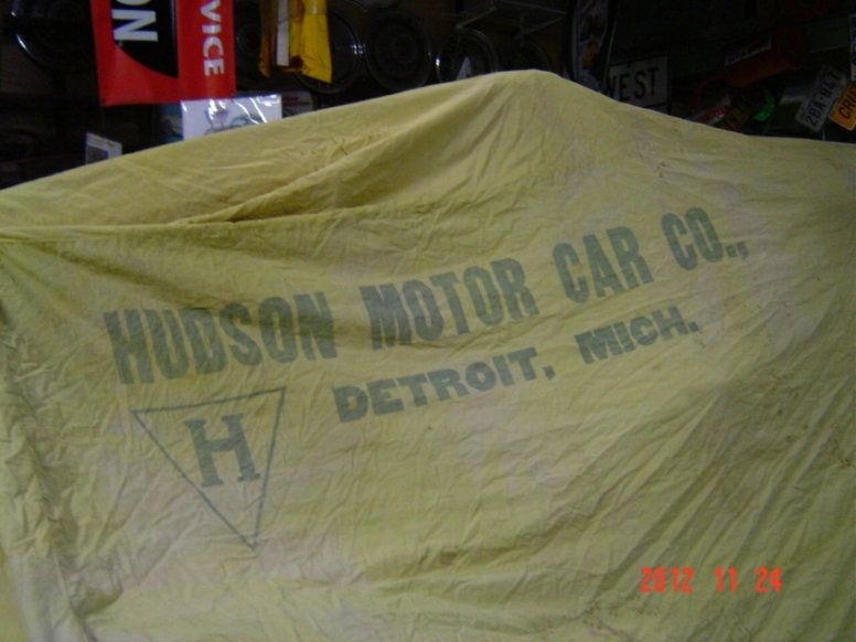 I would like to sell this huge Hudson Dust Cover to someone that could utilize it and could bring to French Lick if any interest. Its color is slightly faded but in very good condition considering its age. The picture is tainted from my garage lights. The cover completely covers my '37 Hudson actually drops to the floor. (I have it pinned up to show the Logo). I haven't opened it again, but think the Logo is on each side...