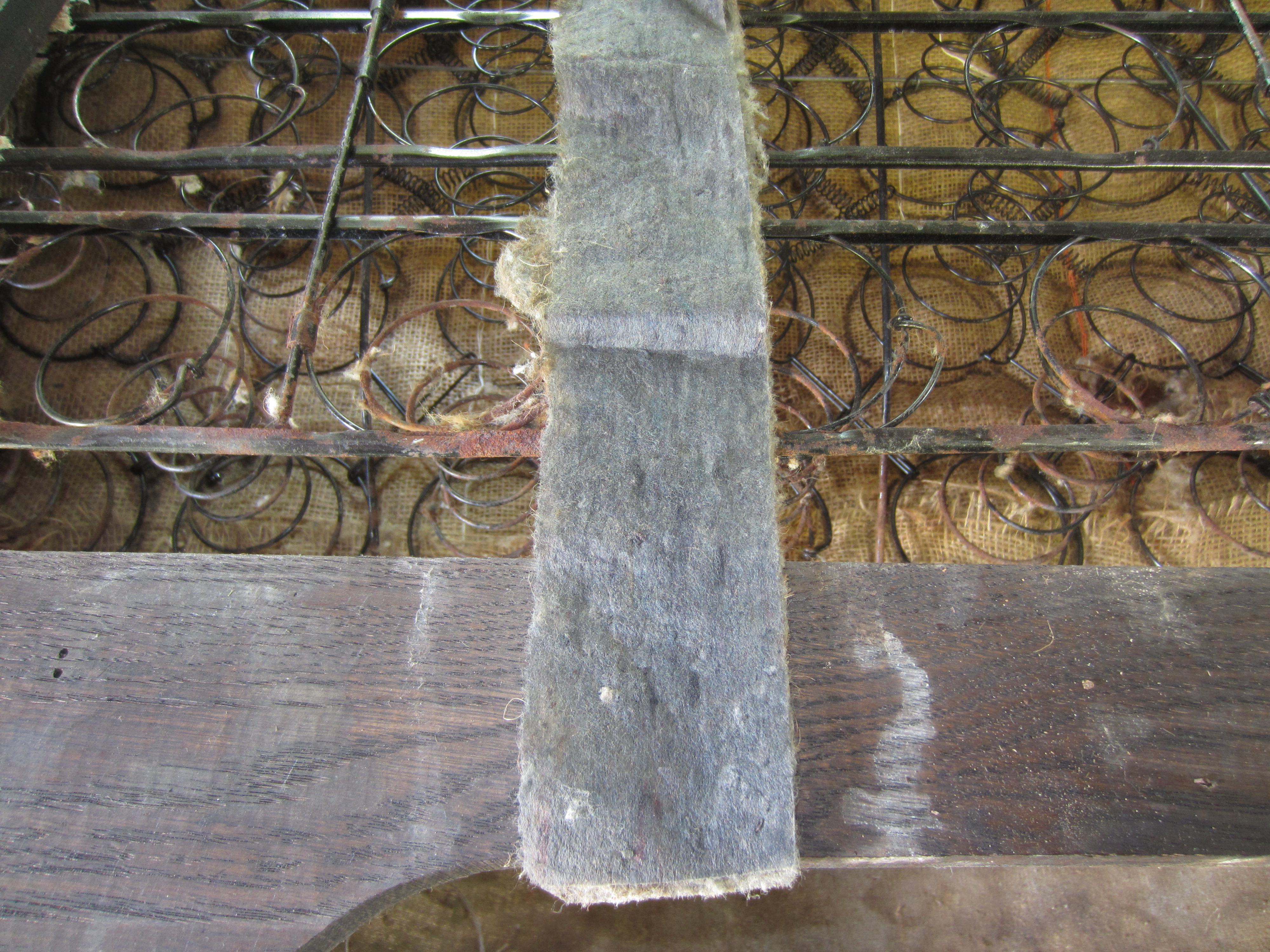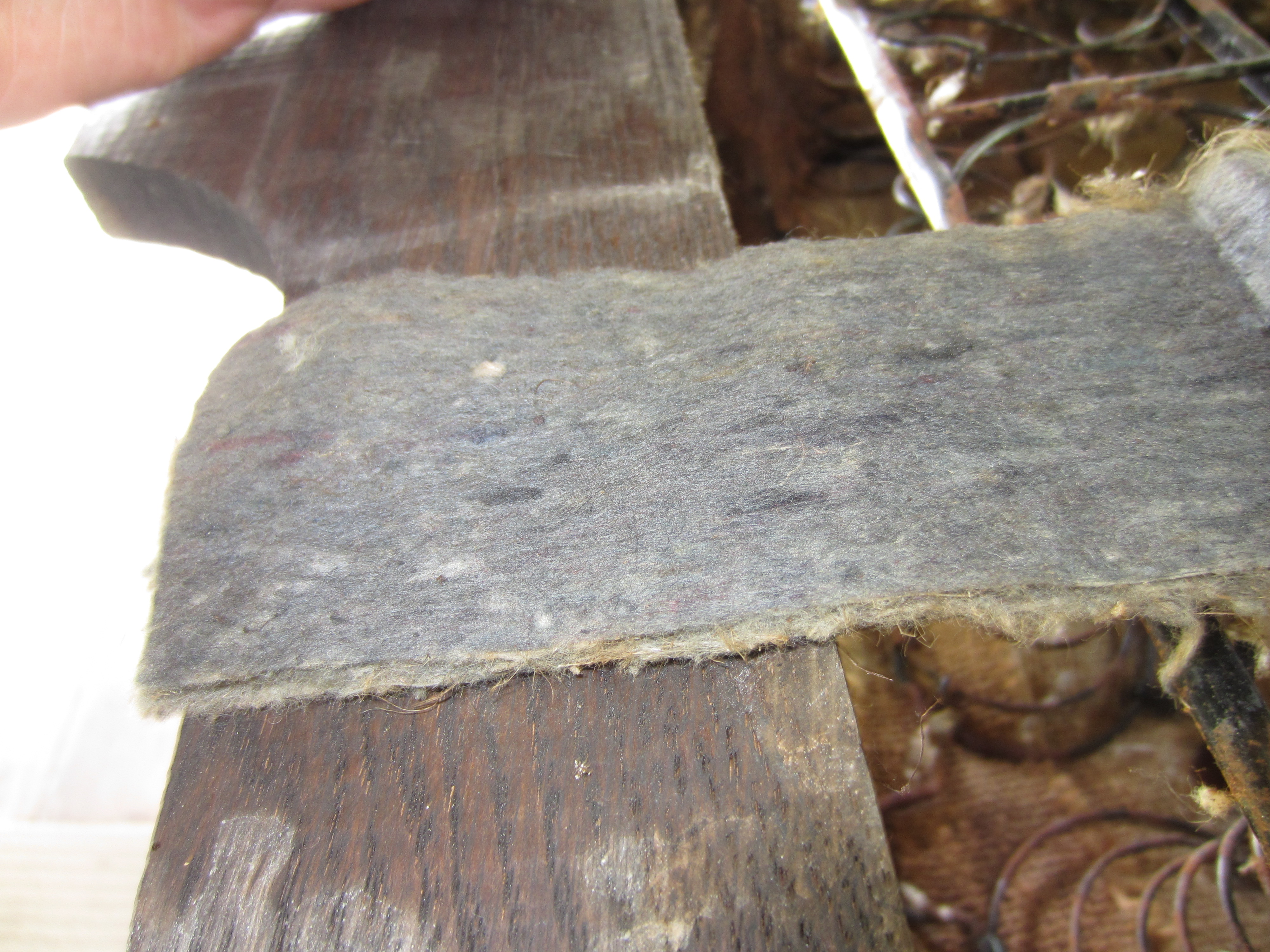 During my wiring project I'd seen a few walnut shell pieces in the trunk and decide to removed the back seat to investigate. The back rest of the seat was about a third full of old dried empty walnut shells. In cleaning them out I found what remained of the previous tenant. There are walnut trees around my father in laws barn were the car spent about 26 years. Anyway, I removed the backing board on the seat. I've attached pictures of the material that was between the backing board and the wooden seat frame.