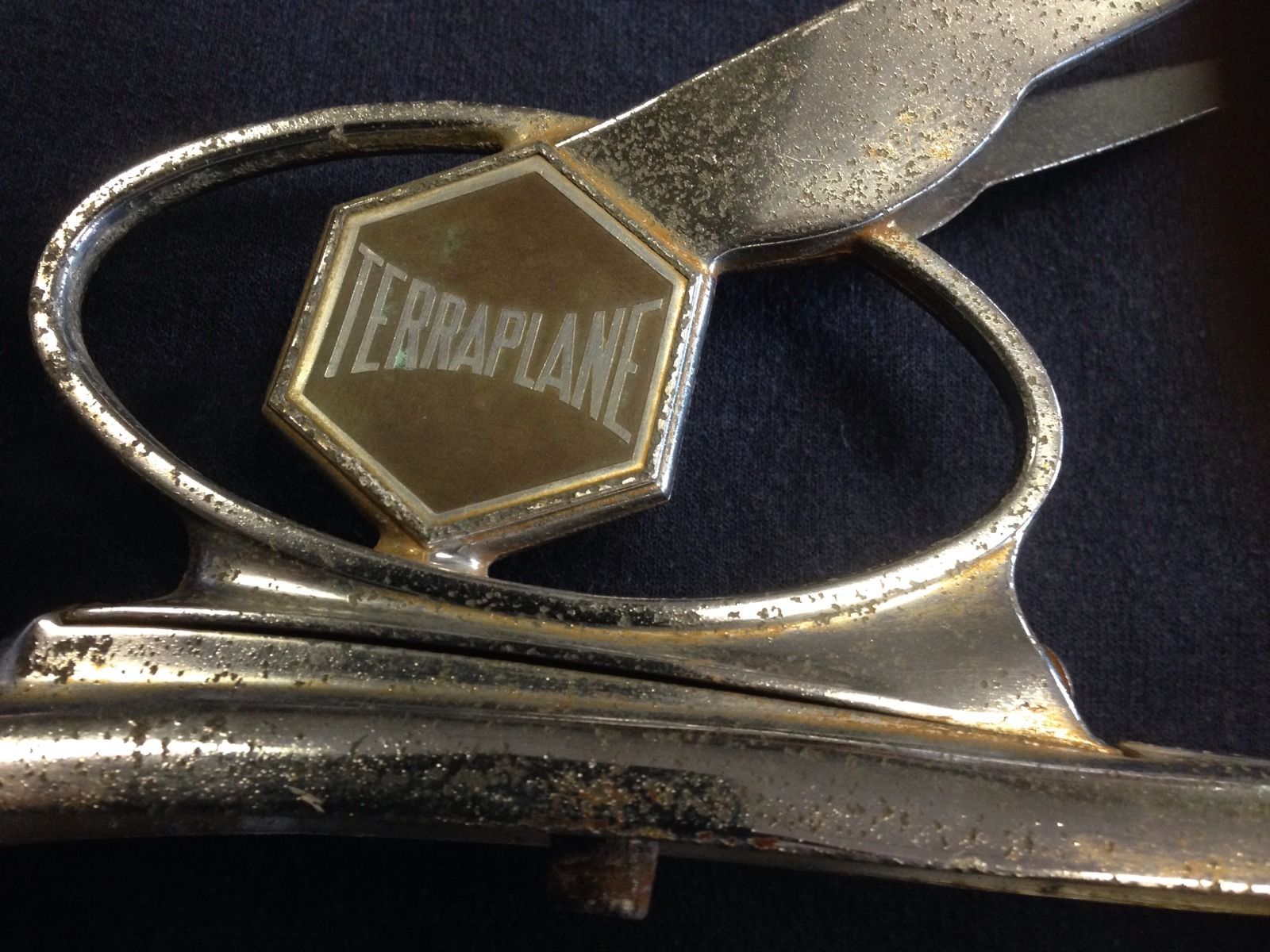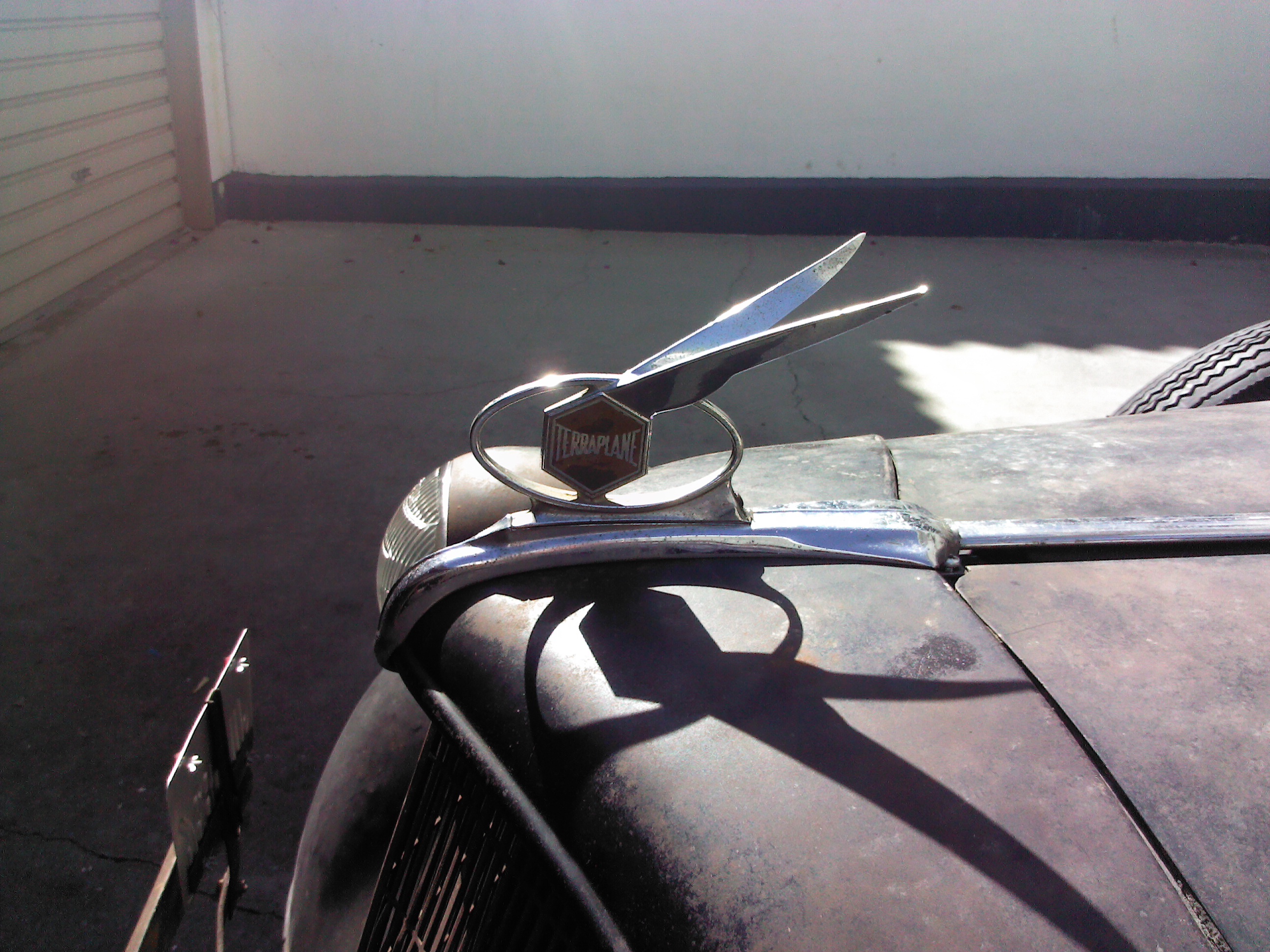 Who remembers the new 34 Terraplane? ...Walt? When I got my 34 Terraplane K coupe 41 years ago it was 39 years old and the color around the "Terraplane" logo was brown/bronze color, as is this one pictured on EBay recently. I also got a couple of the reproduction 34T hood ornaments when they were available and they were painted a white/cream color around the logo ...as I recall, the explanation was that they were originally a white color and turned brown over time. Looking at this EBay example, the coloration around the logo appears to be metallic and not 'painted' at all. Anybody know what color they were new?