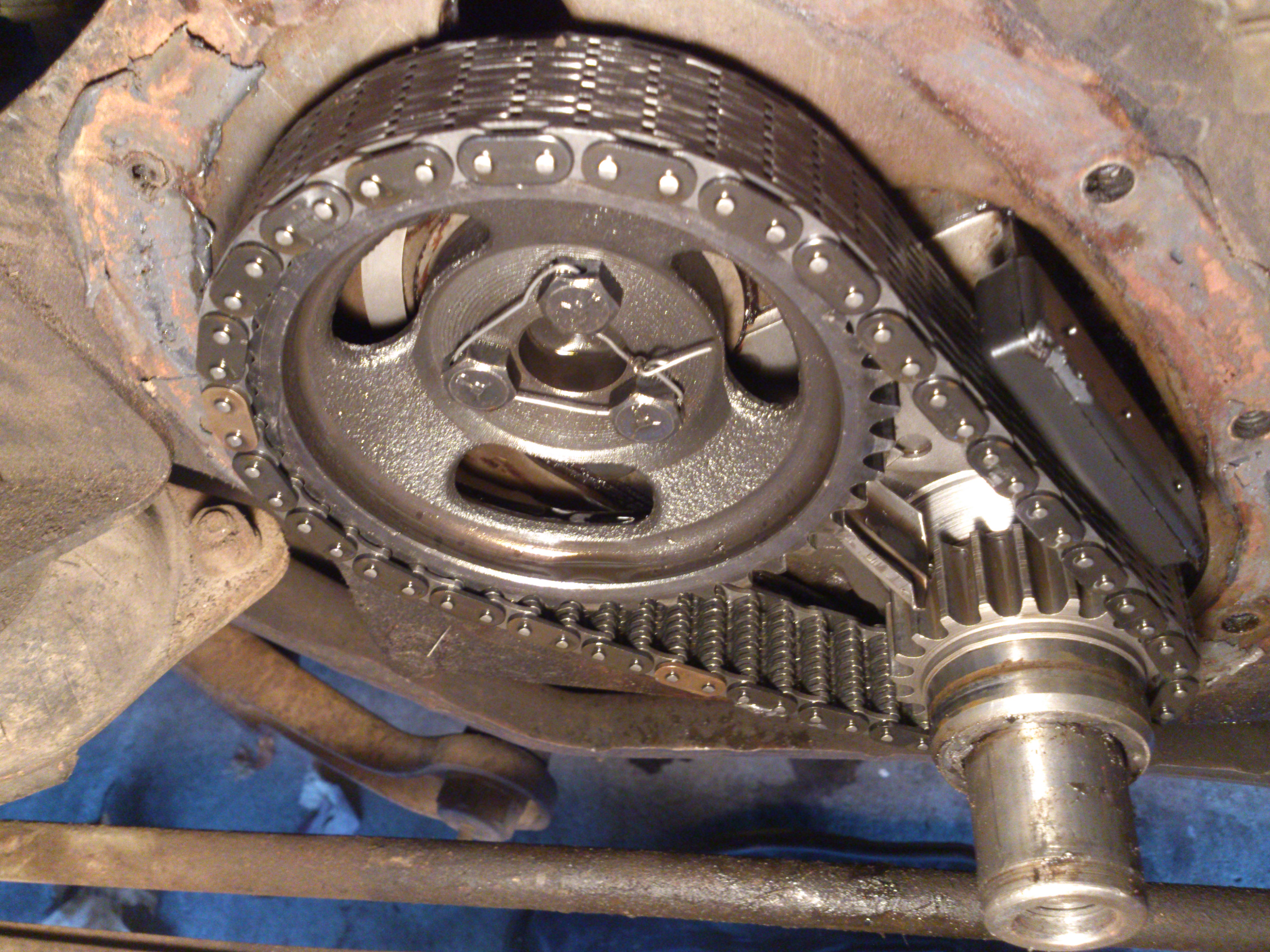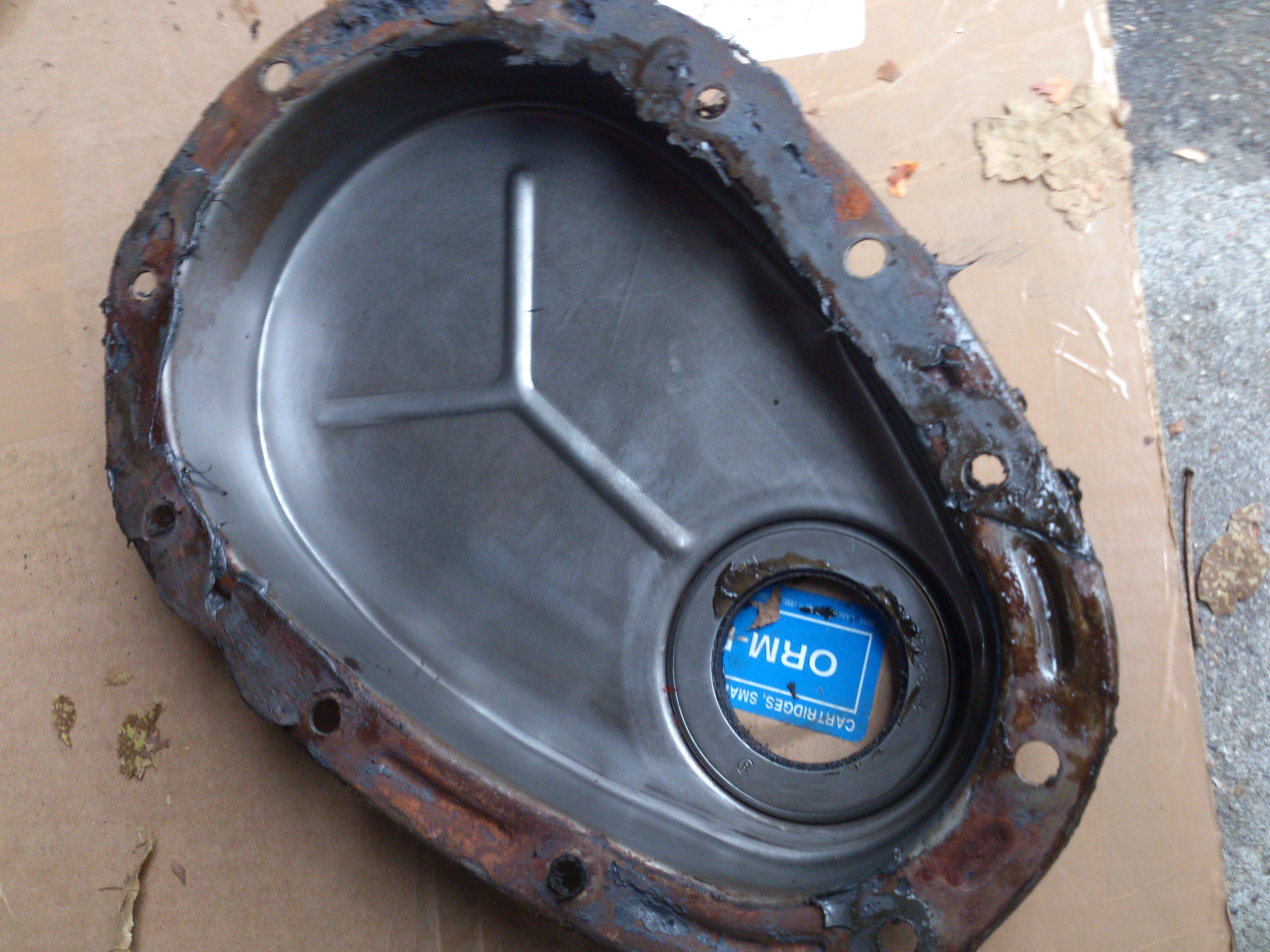 Here is what I found. A timing cover put on with a gasket in a tube... obviously failed and was leaking oil badly. The timing chain and pulleys looked good however. Your thoughts?Thanks-Ray0
