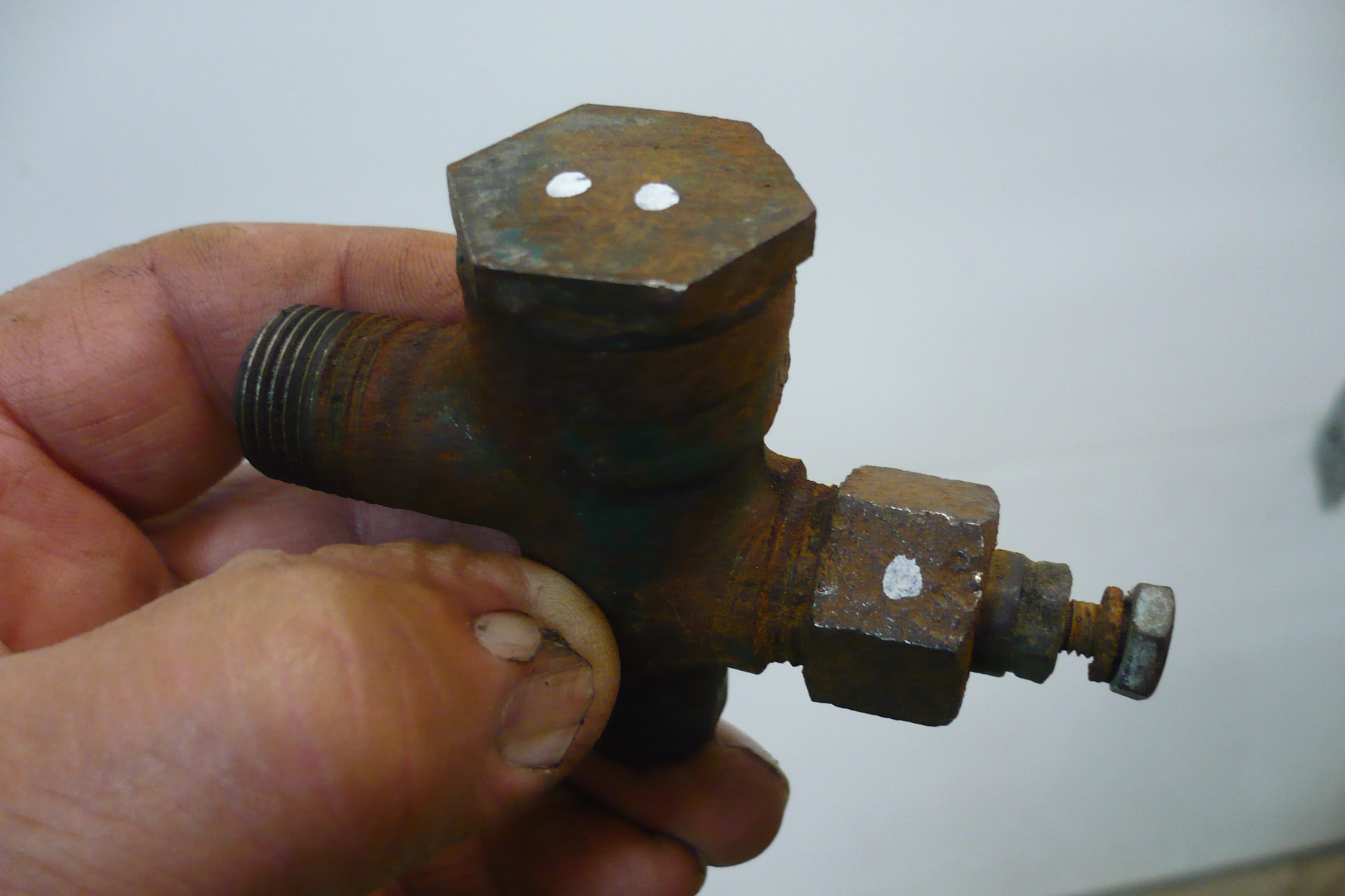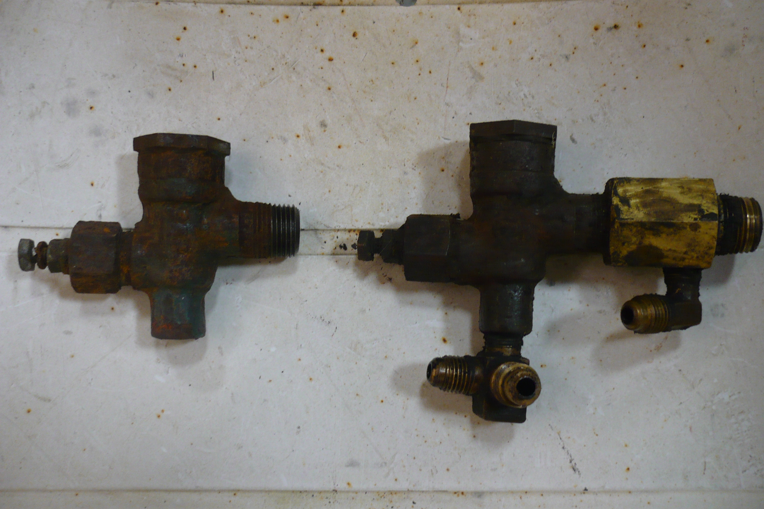 The unit on the left is the standard Hudson "check valve" assembly, with switch. The RH example is one with the optional bypass oil filter attachment fittings which you may or may not have had. Obviously, the nut/stud to the left is for the wire to the light.