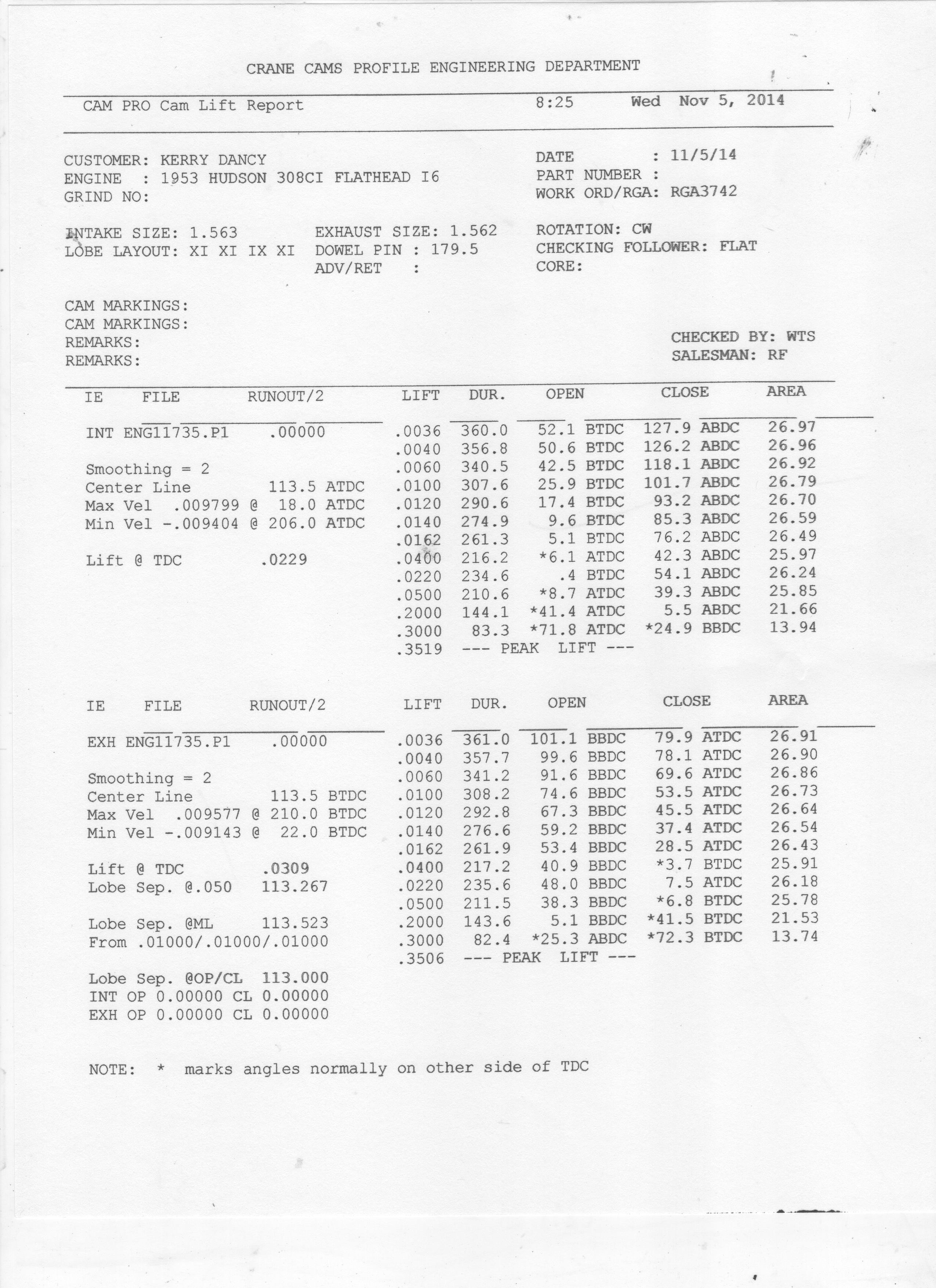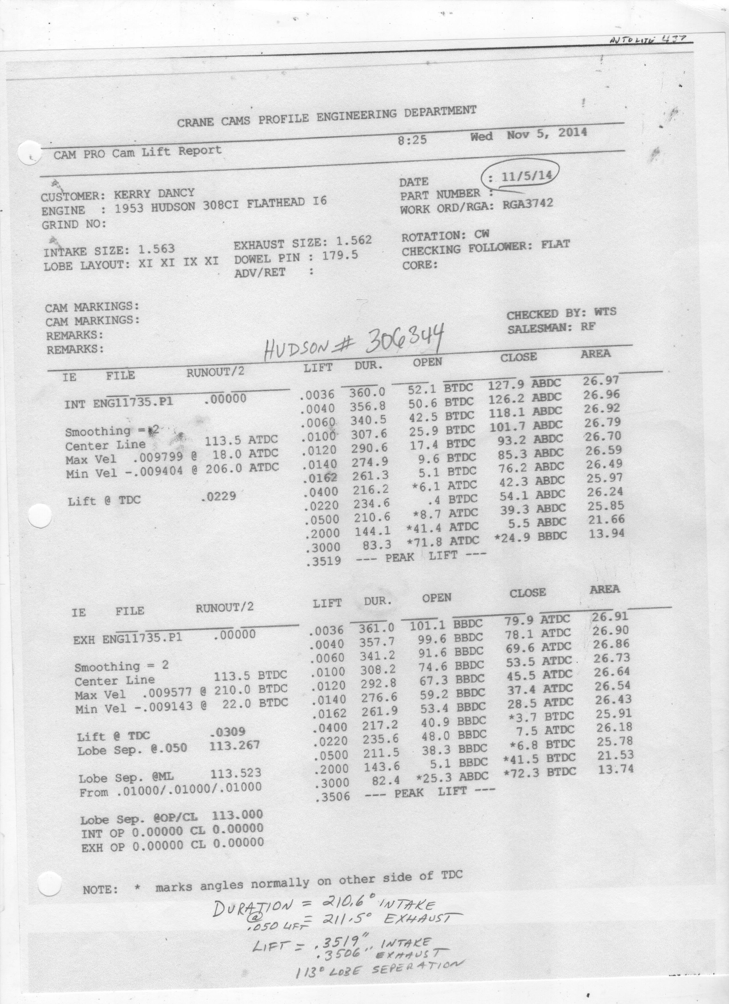 Well, just for what it's worth, my first good-running Hudson (and the fastest of all) was a '51 Hornet with a '56 engine. Being young, I took out the hydraulic cam and put in a flat-top 7X cam and solid lifters, cuz I figured it would give me more power. That car ran really strong and the idle and drivability were very good. I drove it as my every day car for a long time and I'm sure the cam chain eventually stretched but I never changed it. The only trouble I ever had with the engine was it was hard to start when hot because the head was milled rather generously. My point is, strictly as an armchair observer, your cam specs look very radical and I doubt the flat top in my car would have run so nicely if that were really the spec. Go figure.