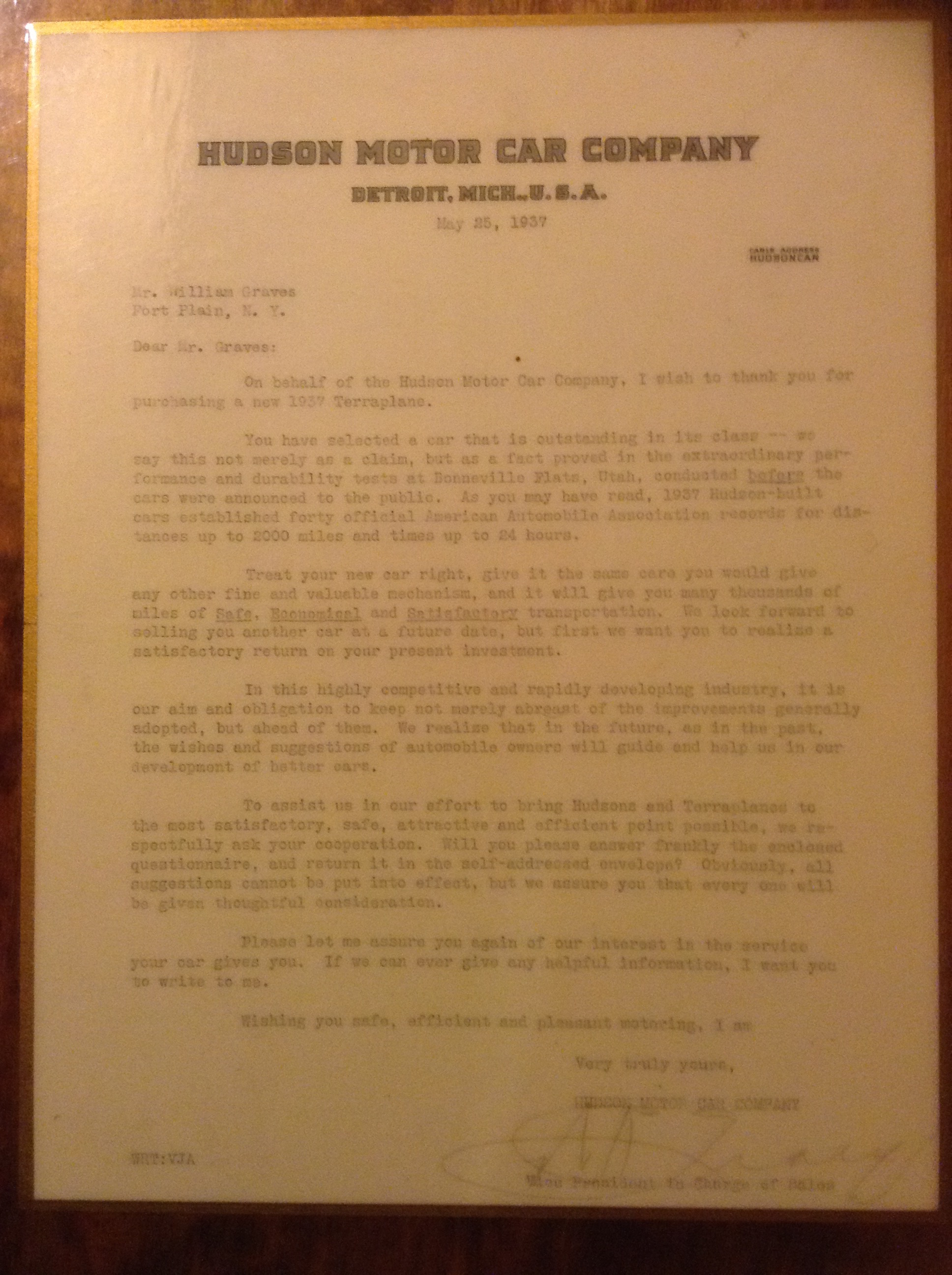 The car is "the standard" by which all 1937's would be judged: an absolutely stock, low mileage 1937 Terraplane model 71.  Prior to its ownership by the seller, it was owned by H-E-T member Duke Marley who resides in North Carolina, U.S.  Before that it was owned by a succession of Hudson guys, one of whom was Jim Many in New York.  It is rare and unique because it is unmolested and original in every way (although I understand that the present owner has rebuilt the engine and clutch).  If you are restoring a '37 and want to know exactly what your car would have looked like when it left the factory, this is the car you want to look at.
