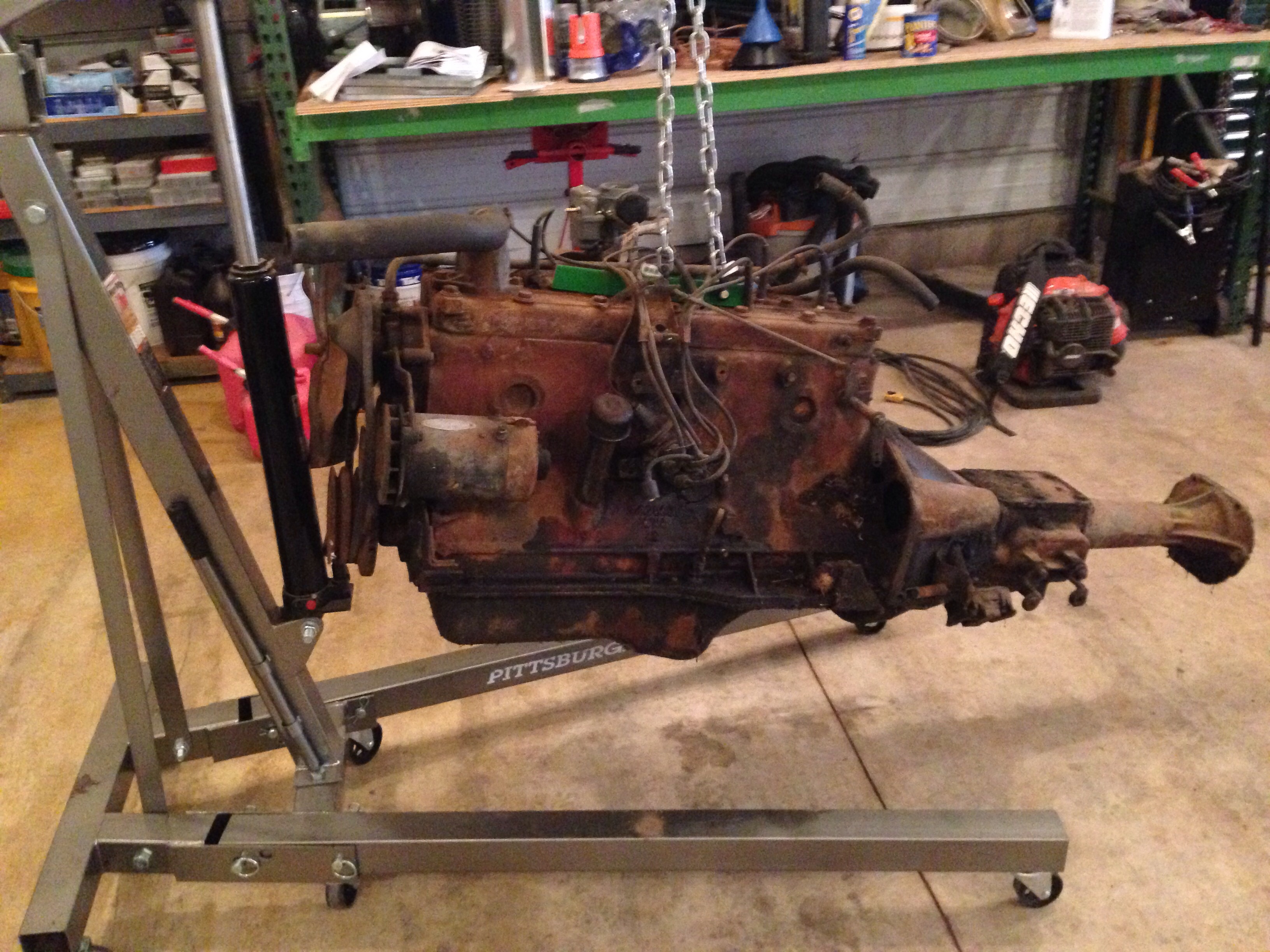 The engine is out of the car and ready to be crated. Fastenal? I attached a pic. The transmission and bell housing are currently removed from the engine.0