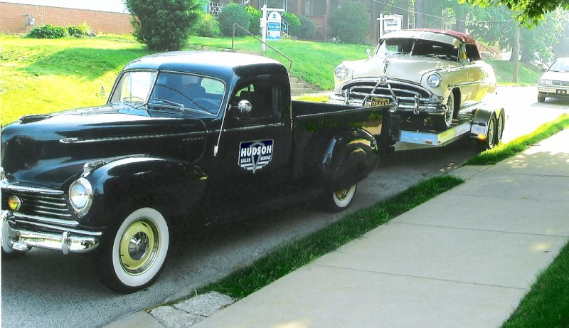 That pickup appears to be painted "Barharbor Blue" a 1946 Hudson color. My Son, Dave Bean painted his '46 pickup that color after he completed the restoration of the truck back in 1983.