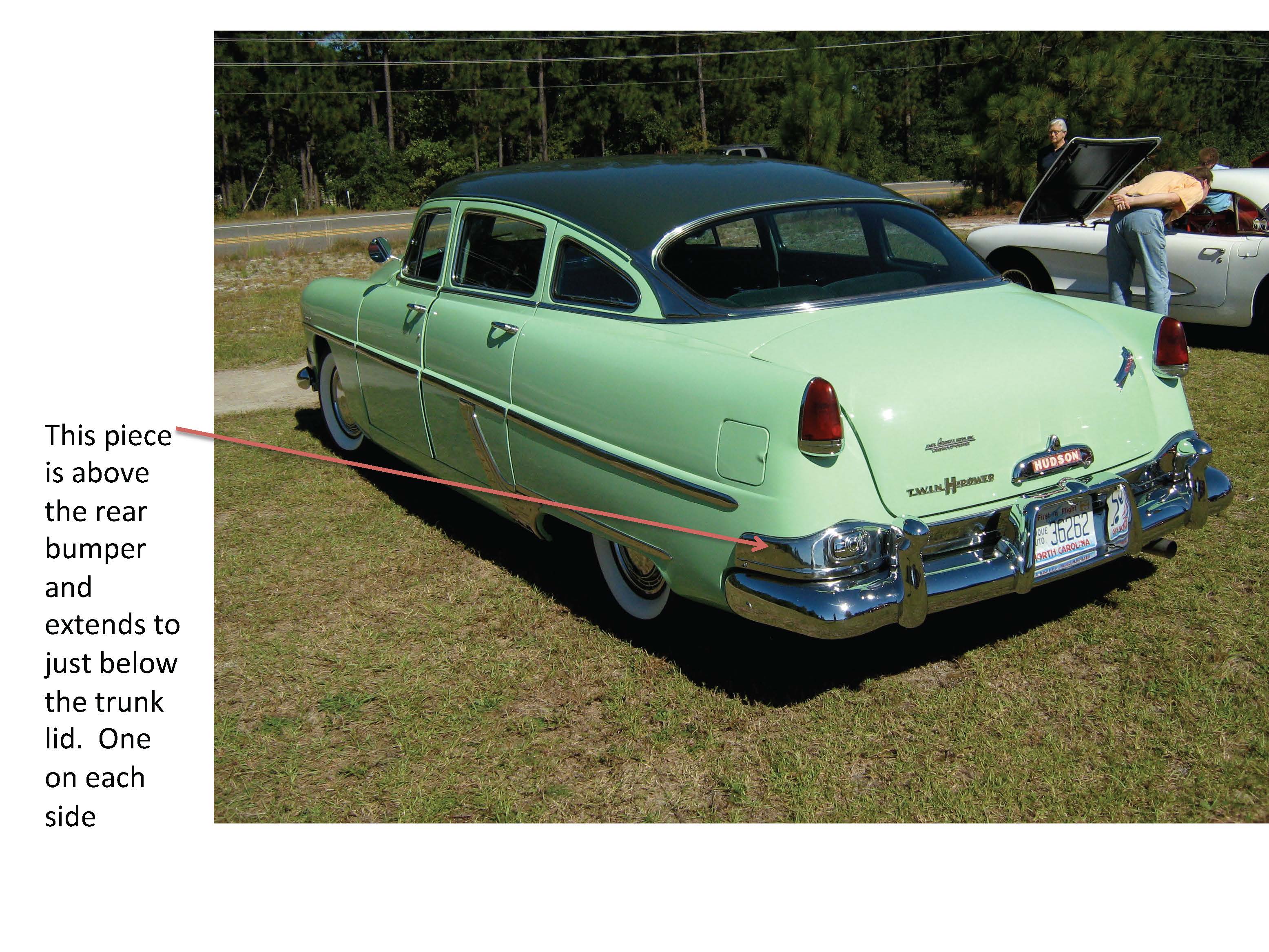 I am looking for the chrome trim pieces that are above the rear bumper of a 54 Hudson Hornet (not on the Hornet Special) on the left and right hand sides as indicated in the attached photo.  My existing pieces have major dents but could possibly be restored.  But I would rather find undamaged pieces.