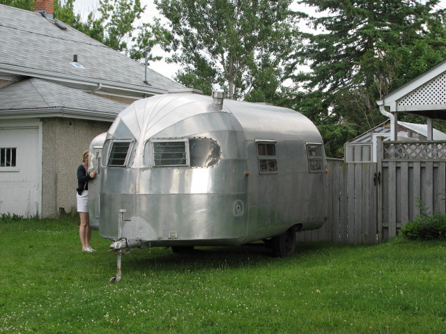 The trailer looks like a 22' Silver Streak (Clipper Model )around 1949-1952.I am working on one to pull behind the 48 someday if I ever get it done.Will need to figure out a good hitch for the stepdown.0
