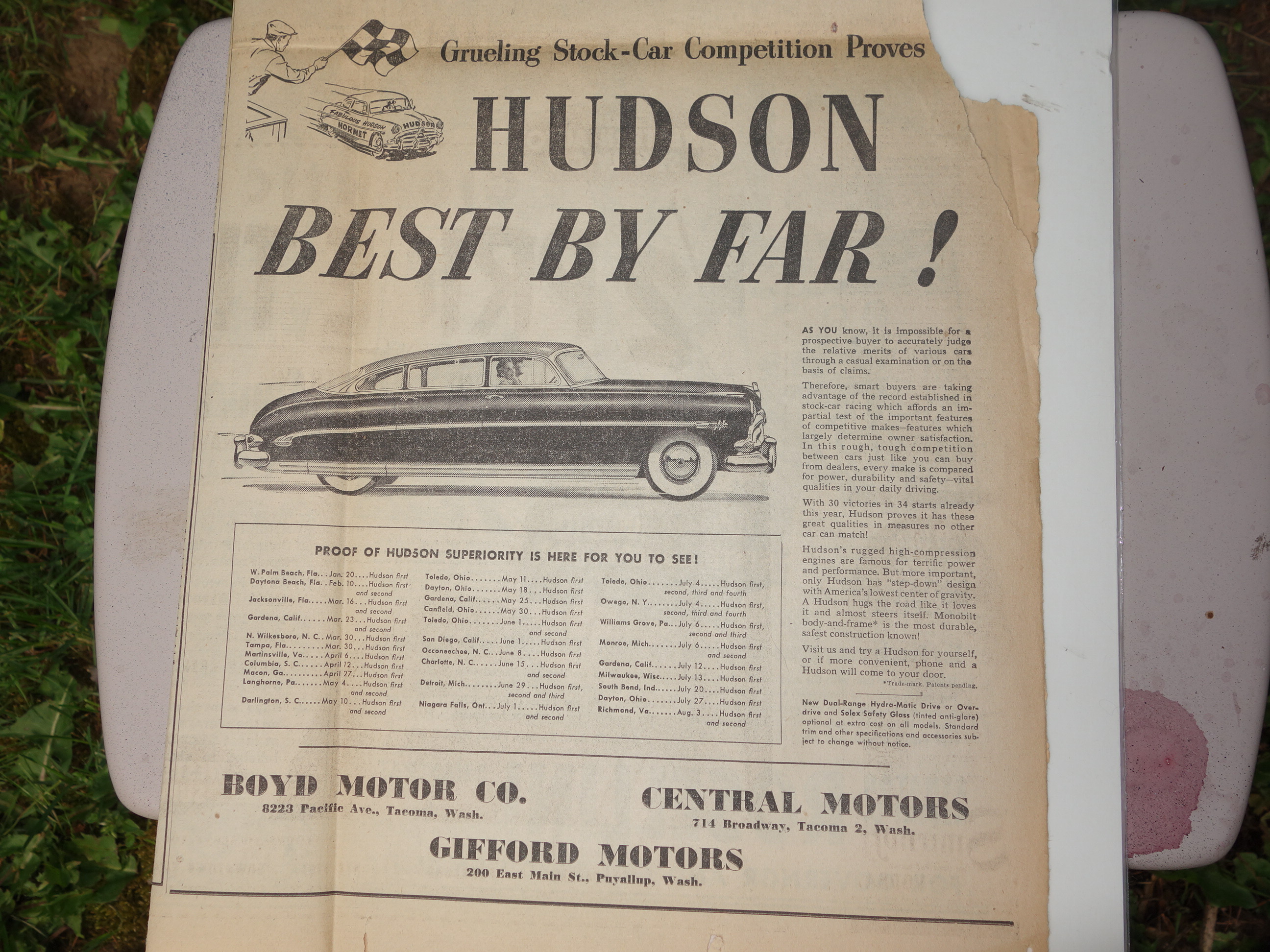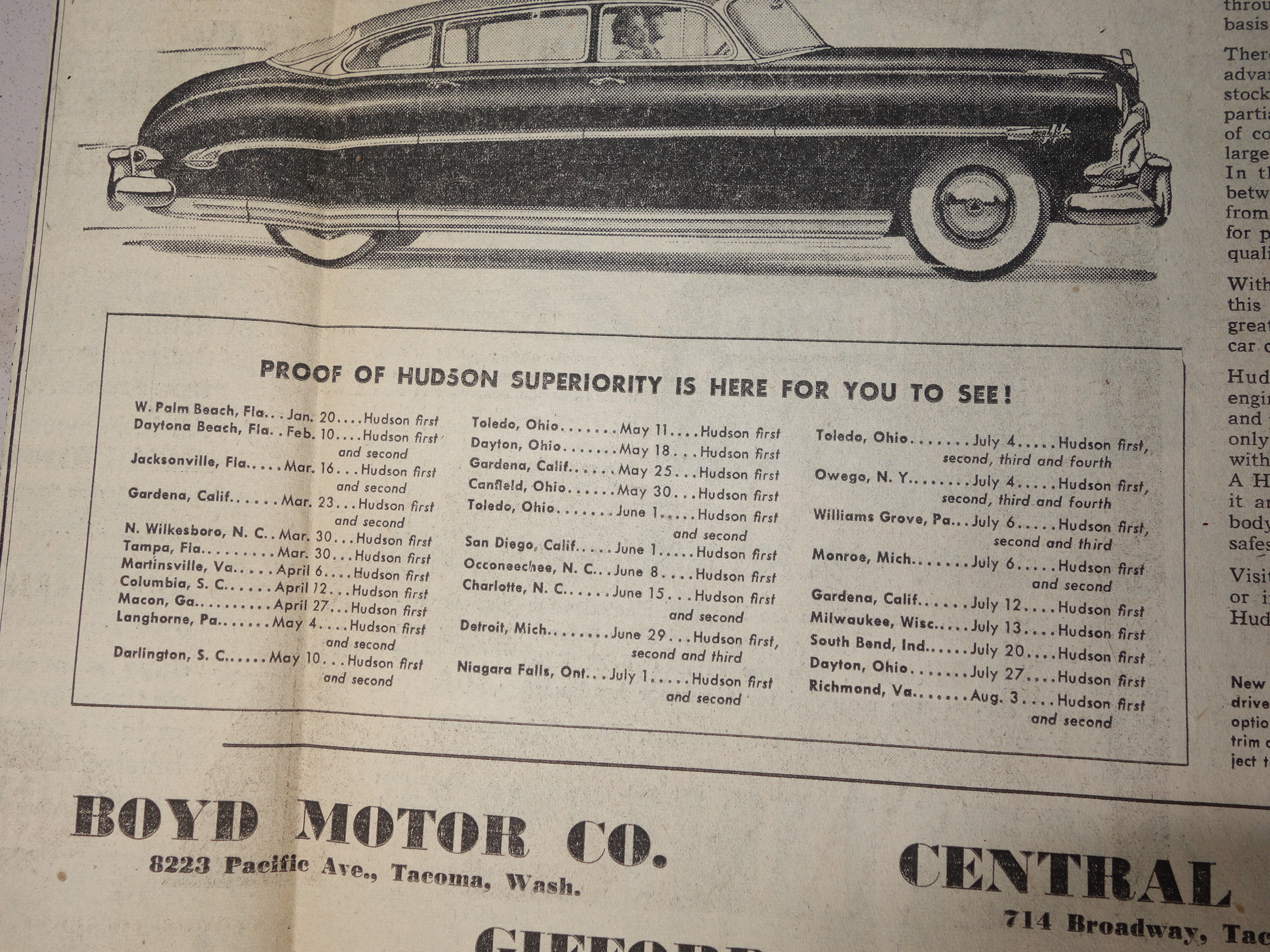 Hudson Tacoma Washington Newspaper Ad from August 1952 shows Hudson Racing Record for 1952