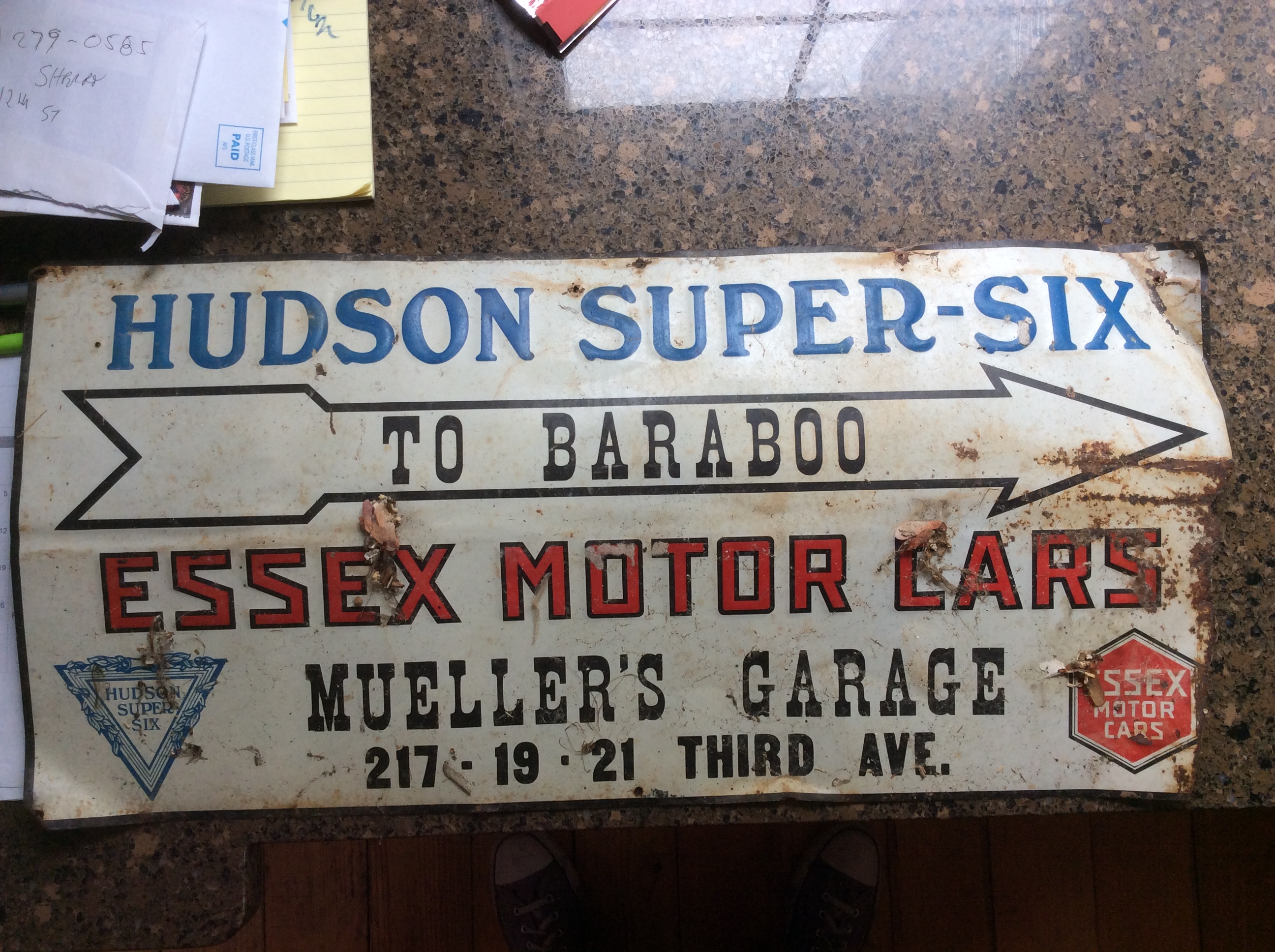 Wow, that's a rarity! I think that is one of those painted or silkscreened signs (as opposed to the porcelain ones) that were nailed to the sides of barns or trees, out in the country. The dealer bought them and had his name applied at the bottom. They indicated where the nearest Hudson-Essex dealer was. But since they were cheap tin they rusted away -- as opposed to the porcelain dealer signs that survived even under the most adverse conditions. And of course, while the porcelain signs were attached to a building and were obviously valuable, the tin signs were considered throw-aways. Being out in the public, they were targets for vandalism and theft. The only time you find something like this, is in brand new condition, in a shipping crate that was never opened. Or in the attic of an old dealership.