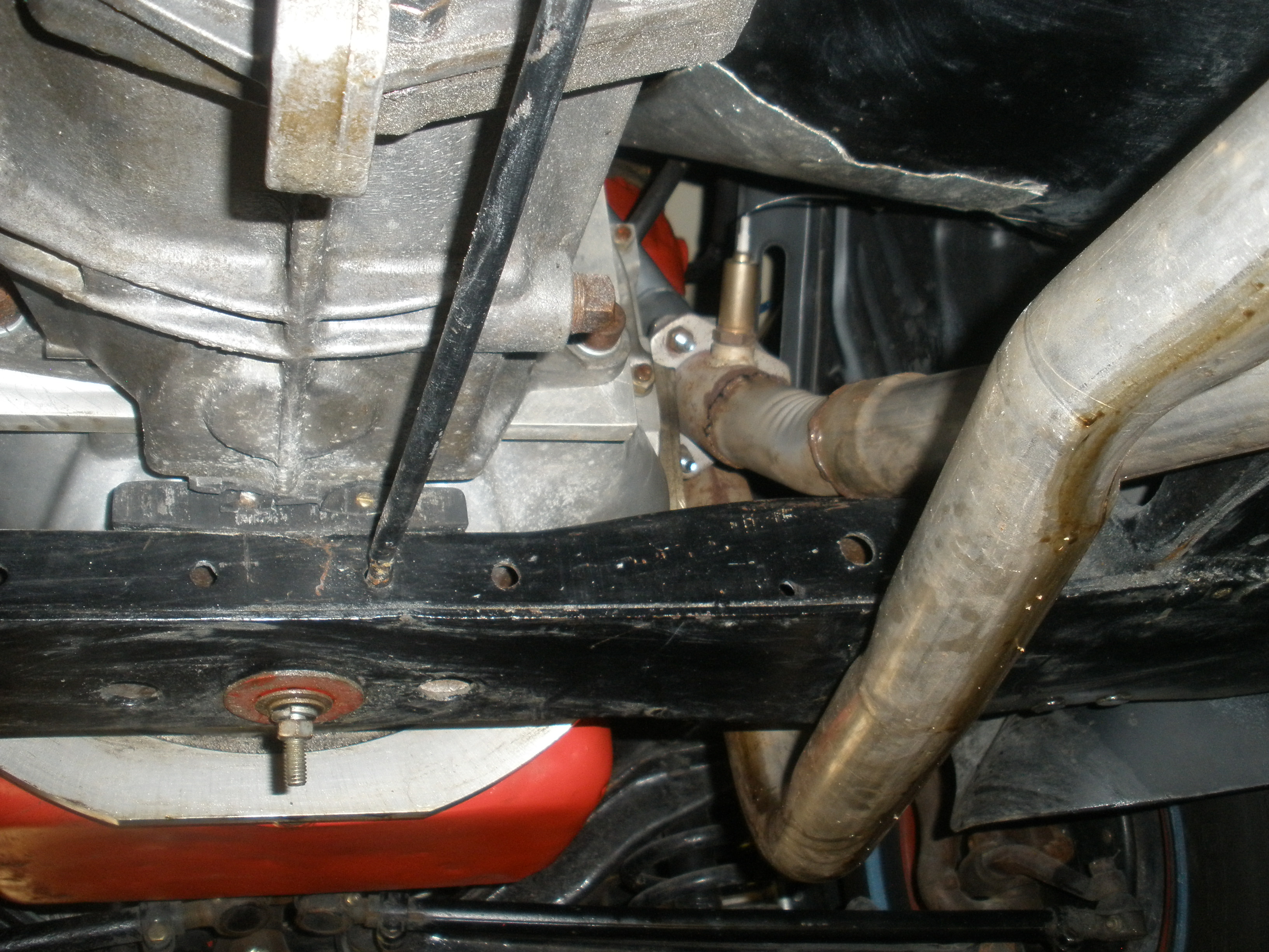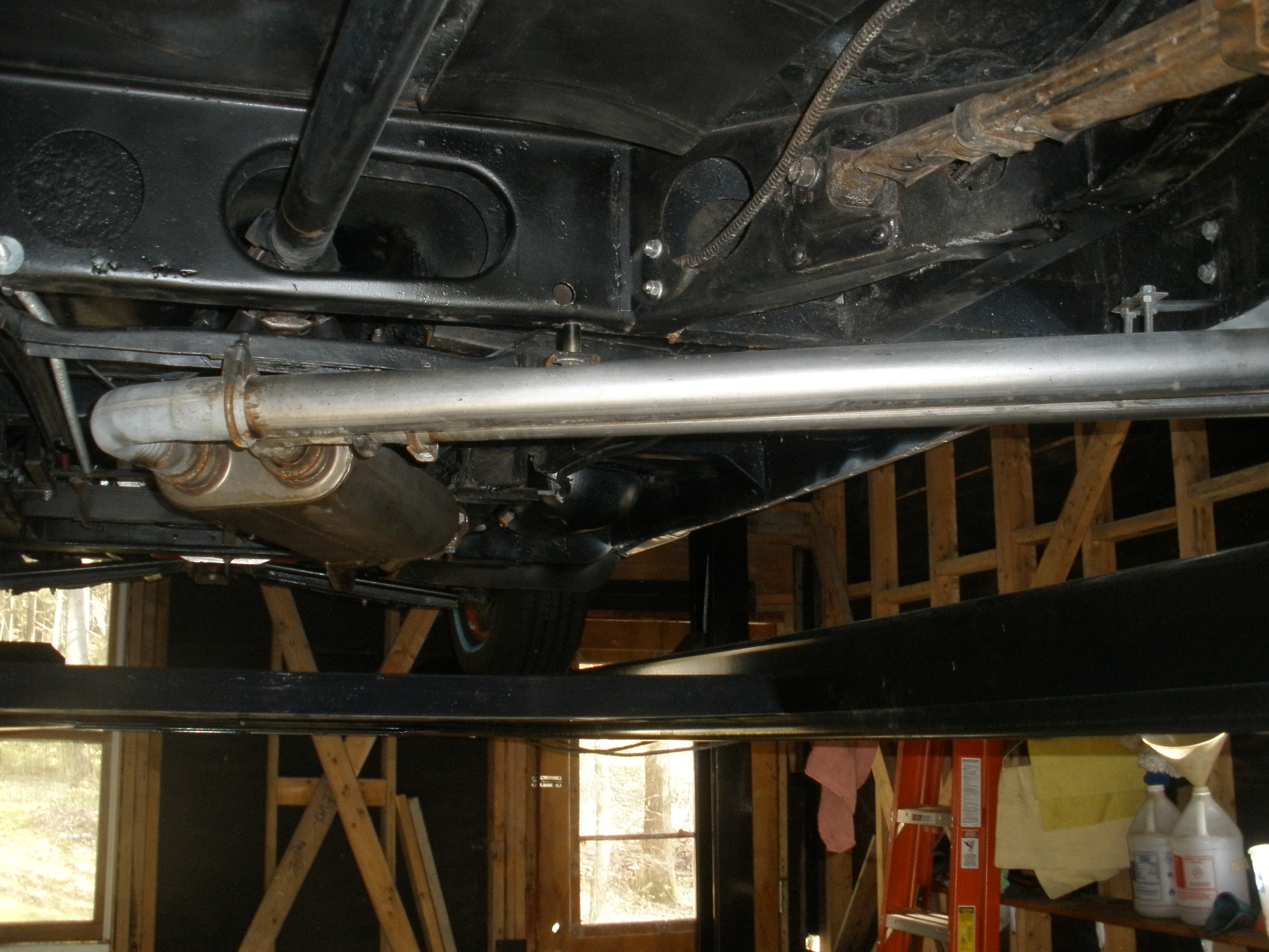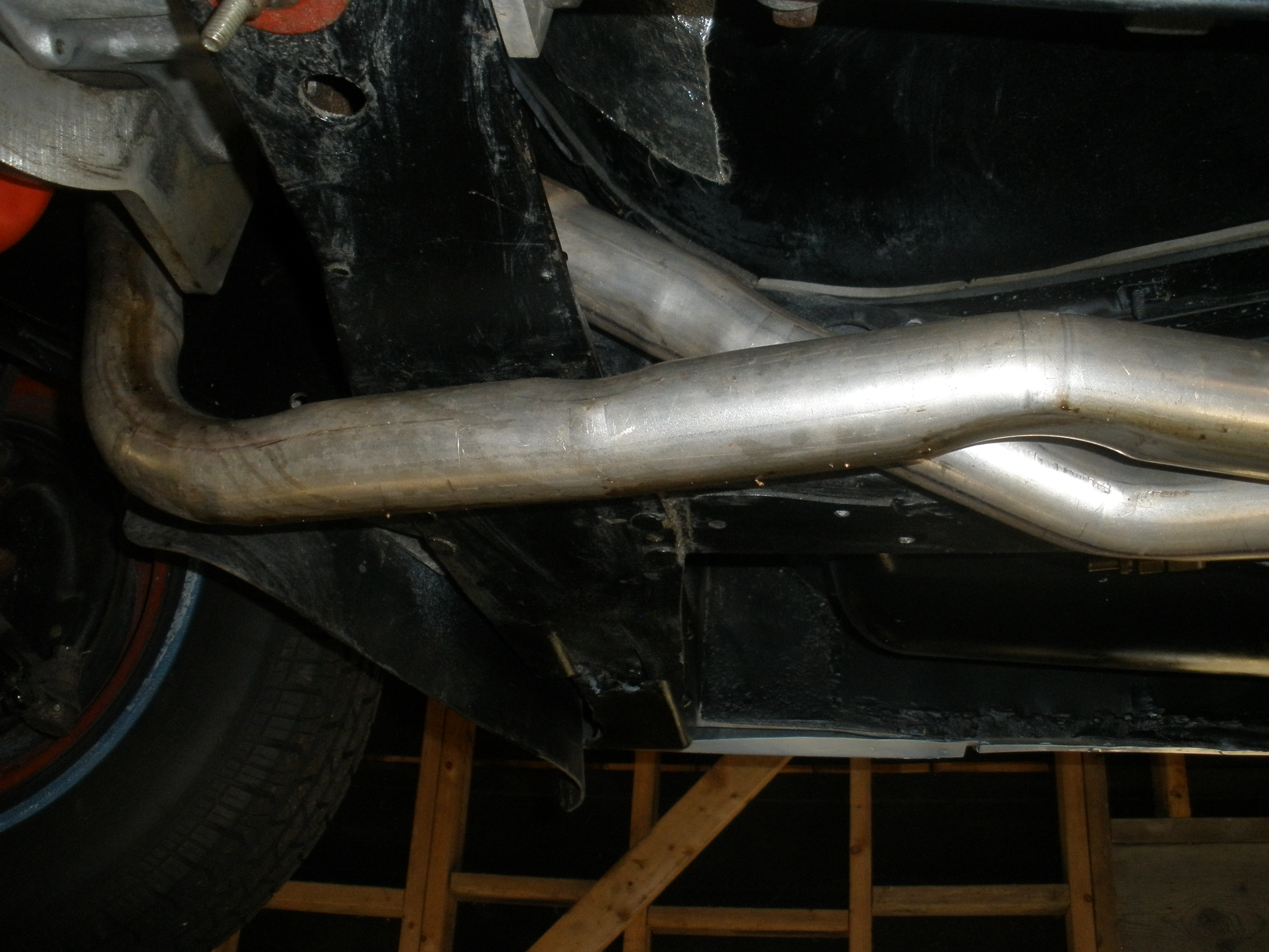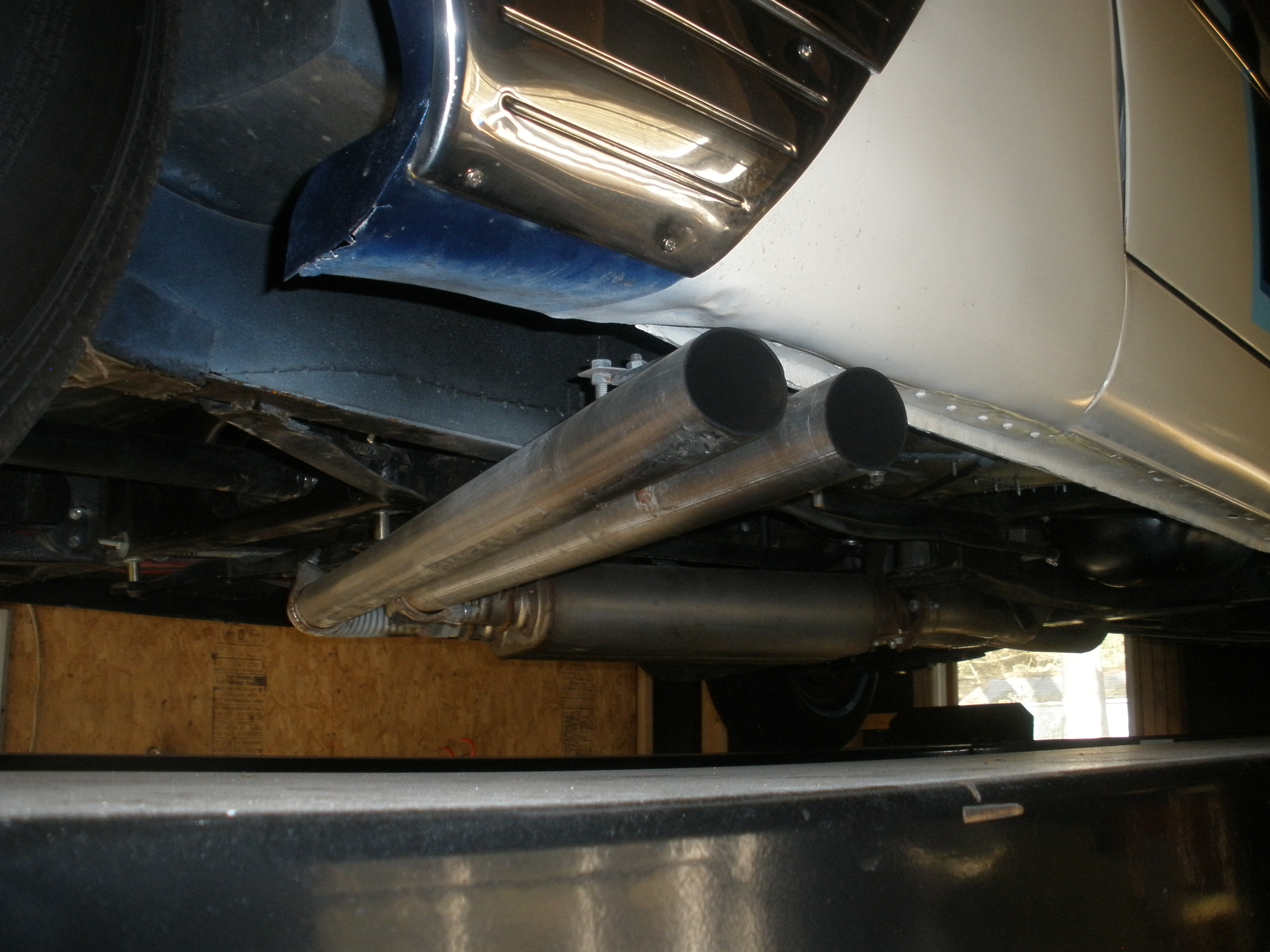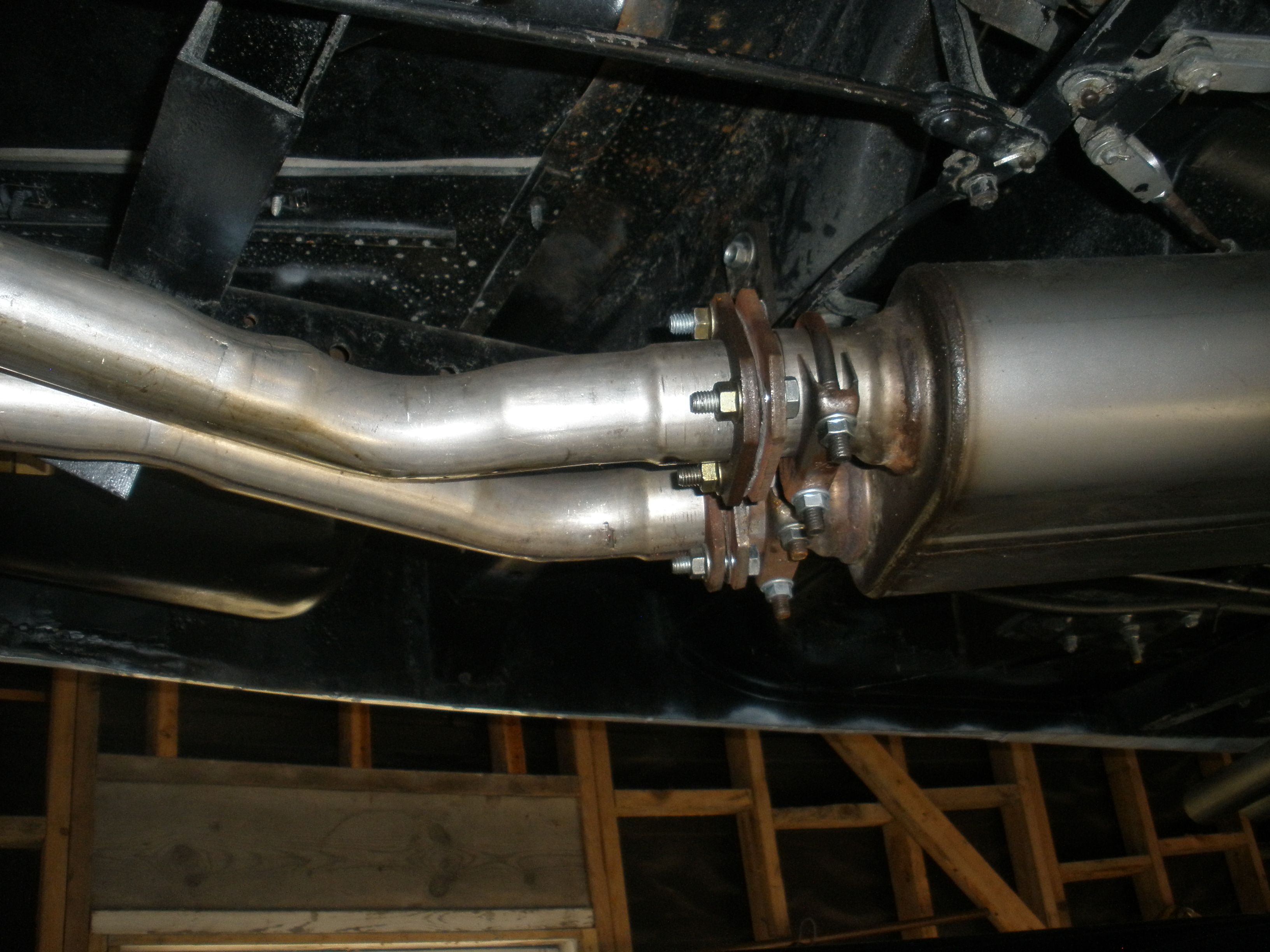 I used a Clifford header (still available?), a pipe over and a pipe under the trans. X-member, both into a Walker 2 in, 2 out dynomax, no cross-over pipe and out the Pass. side.