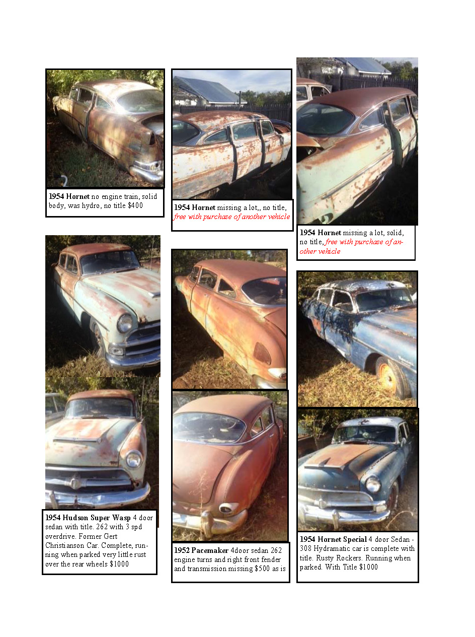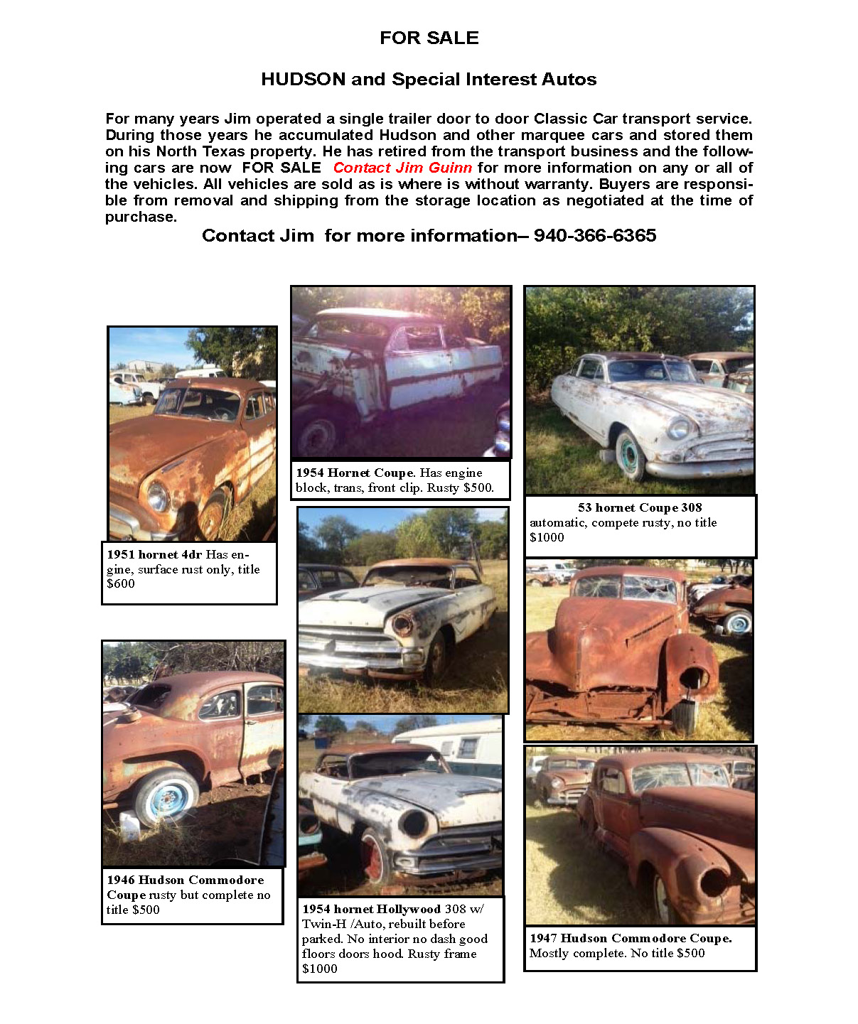 For many years Texas based Jim Guinn operated a single trailer door to door Classic Car transport service. During those years he accumulated Hudson and other marquee cars and stored them on his North Texas property. He has retired from the transport business and the cars pictured in the attached PDF and JEPGS are now FOR SALE  Contact Jim  by email  for more information