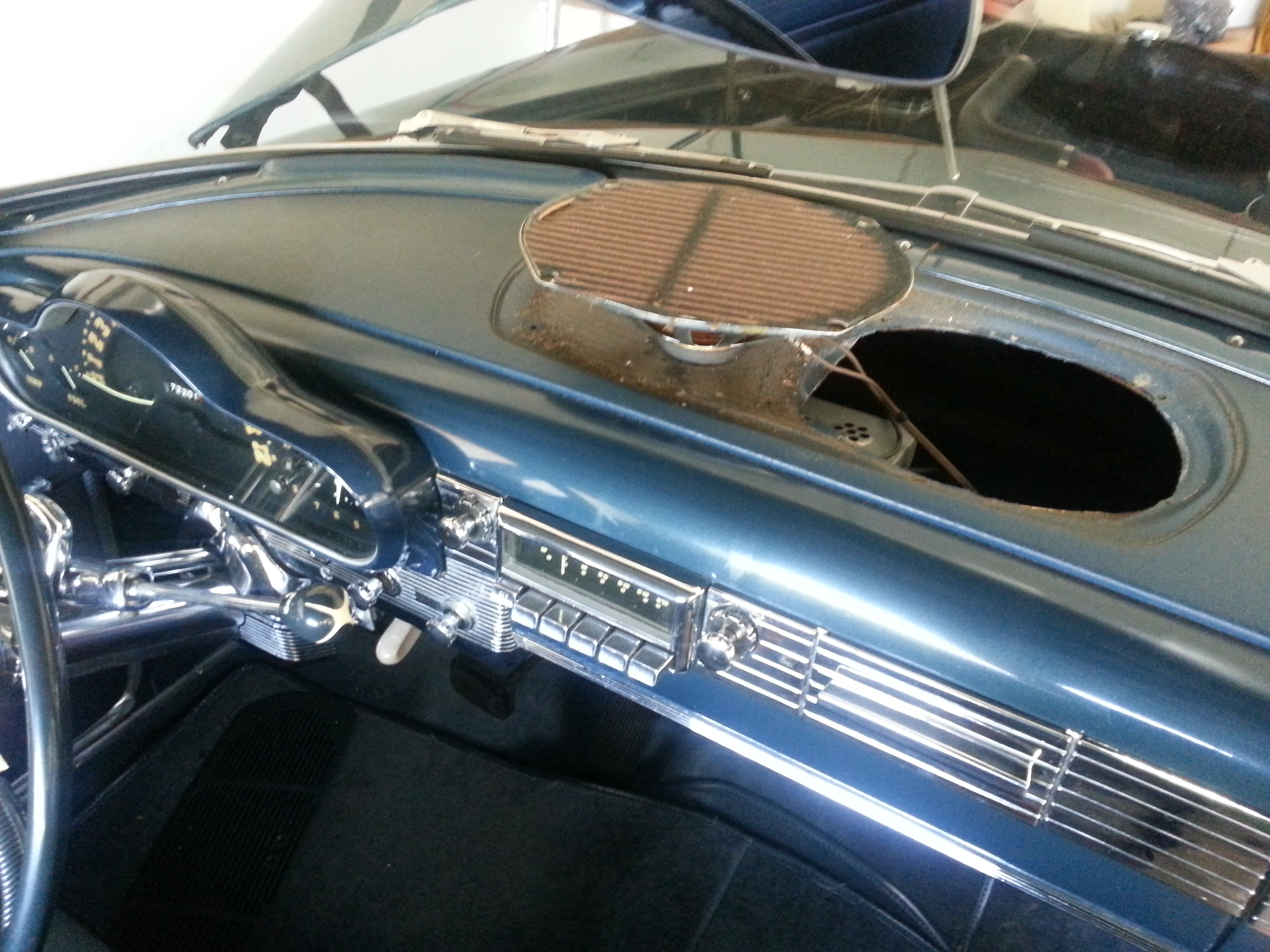 • So, I finally had some time this weekend to tinker a bit, and decided to take off the speaker grille to access the clock.  However, it was pretty much impossible for me to reach the clock from the speaker opening.  MAYBE if the radio was completely gone, and the hole was on the left side...  Unless the configuration shown in my picture isn't stock?  That's a possibility, because I know my uncle had the radio worked on in the 90s at some point... maybe it was modified.  Or am I just missing something?