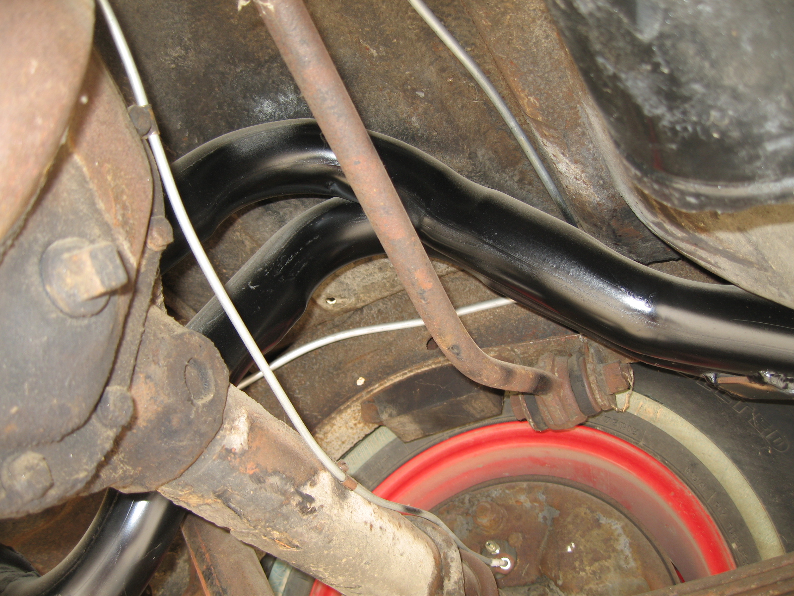 FWIW airbrushguy, Mine's slightly different, but the routing of the pipes is similar to what you are going to have to go through.'52 Hornet, so it has the upright wheel well. '52 and later is the toughest to do duals on, I can assure you. There's just not much room, especially for bigger pipes. I don't have pictures handy, but can explain. Also, what I got is not what I wanted, but the guy doing my exhaust made decisions w/o me. Instead of headers, I've got the 7X splitter which takes it from the manifold and dumps into two pipes right away. Those two pipes need to run side by side on the passenger side of the driveshaft until you get to the heat deflector where the muffler(s) go. Here, you can dump both pipes into one muffler and exit with two or use two mufflers, 1 for each pipe. Mine's got a single muffler, but both options work. From there, once you go over the rear end, the driver side can divert up by the top and in front of the gas tank and then turn beside the tank and continue on out the back.You can't really be up beside the frame at the rear, you have to be below it, as there's just no room. So, if you have a tail dragger, like mine, it's a little sketchy on going up a steep driveway (but the stance is killer). Mine is lowered 1-1/4" in the rear.If you run seperate mufflers, I highly recommend a crossover somewhere, for a smoother exhaust note. If you don't, and you run something like glass packs, you get a loud BAP-BAP-BAP on the rundown, which is obnoxious to me. I prefer a smoother rumble, but that's just personal opinion.0