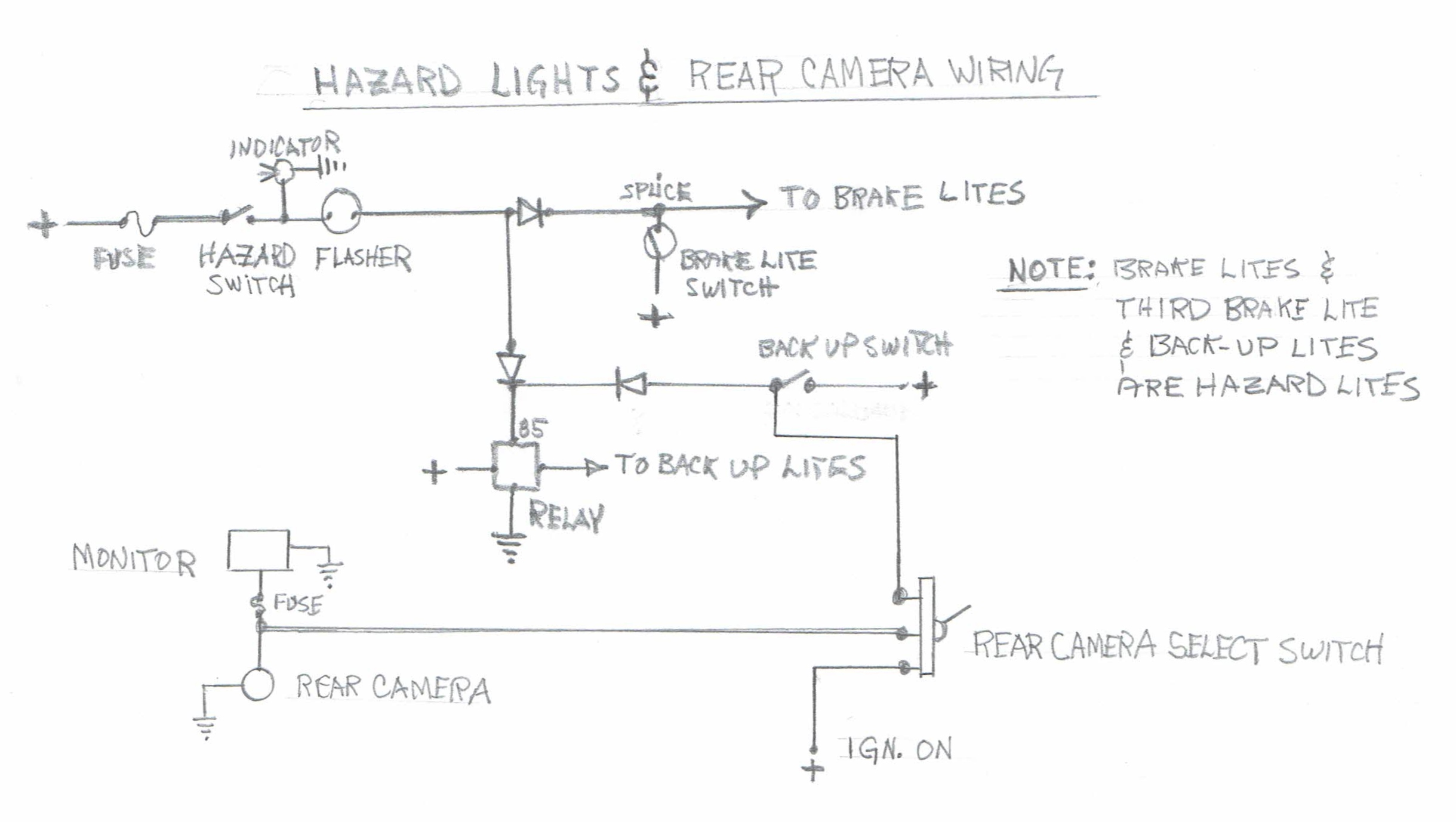 Still raining here but here is the wiring diagram; it is simple. The video connections are not shown but goes from the camera to the monitor with the supplied cord. Note that the camera/monitor wiring is at the bottom of my hazard wiring setup. If that also interests you, note the diodes used to isolate things. Everything works as it should.