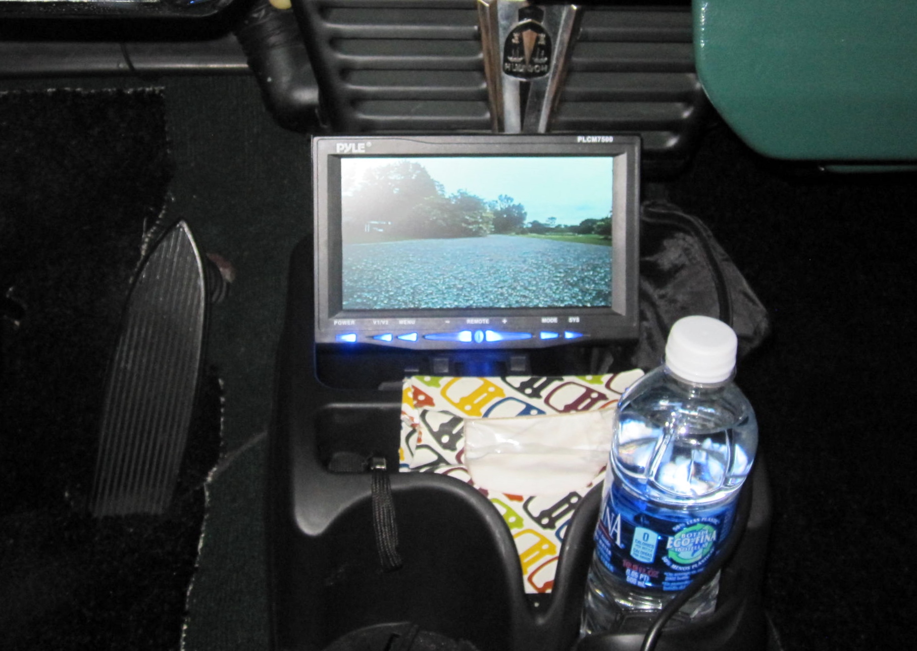 I drilled with hole saw{1/2" for the video RCA end} thru the floor at rear of step down below the drivers right leg then ran the video/power cable to the video monitor. Then seal top and bottom with dum-dum.