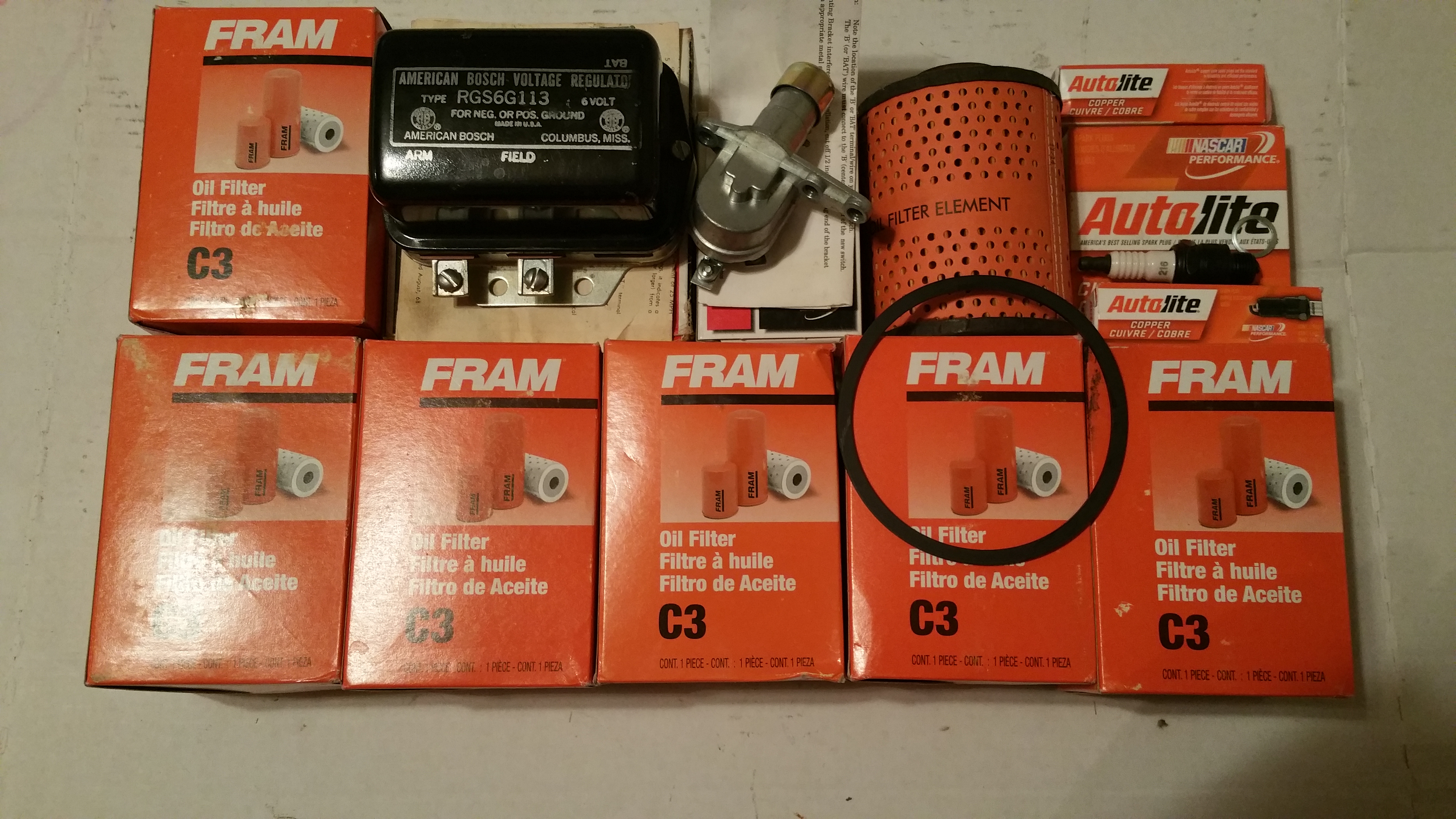 Hudson parts for sale:6 new Fram C3 oil filters, BWD DS118 dimmer switch, American Bosch RGS6G113 six volt voltage regulator, and six Autolite 216 spark plugs. $65 for everything, includes shipping to Lower 48 by USPS Priority Mail. Thanks, David