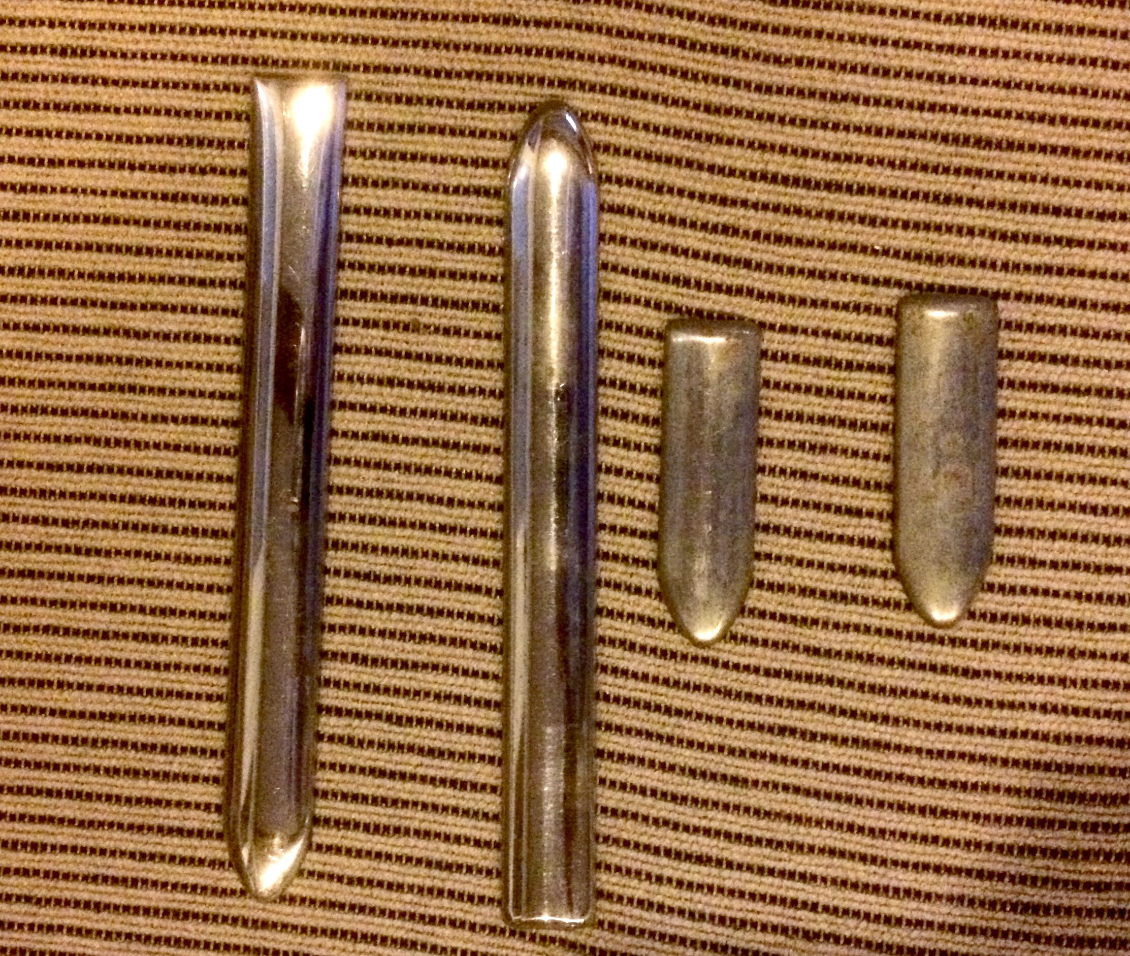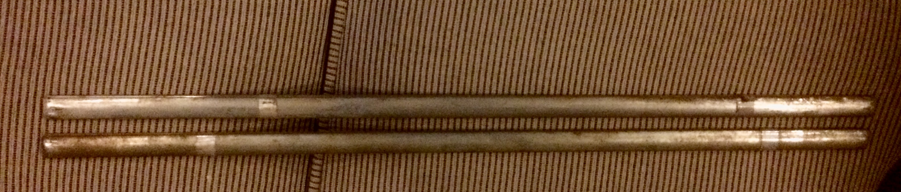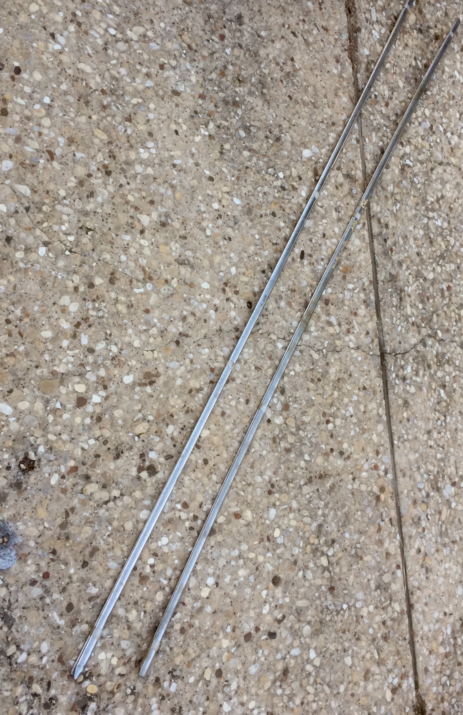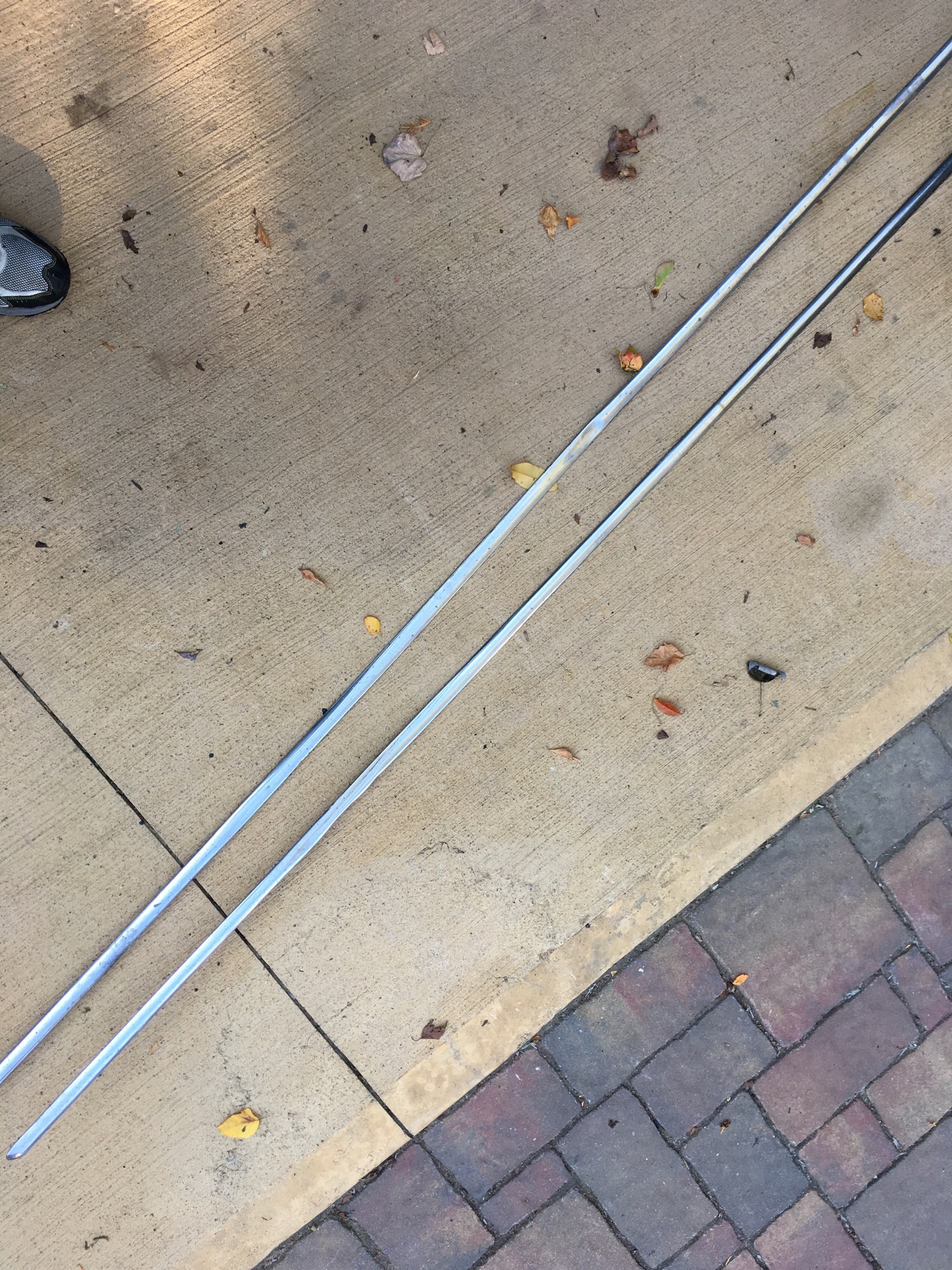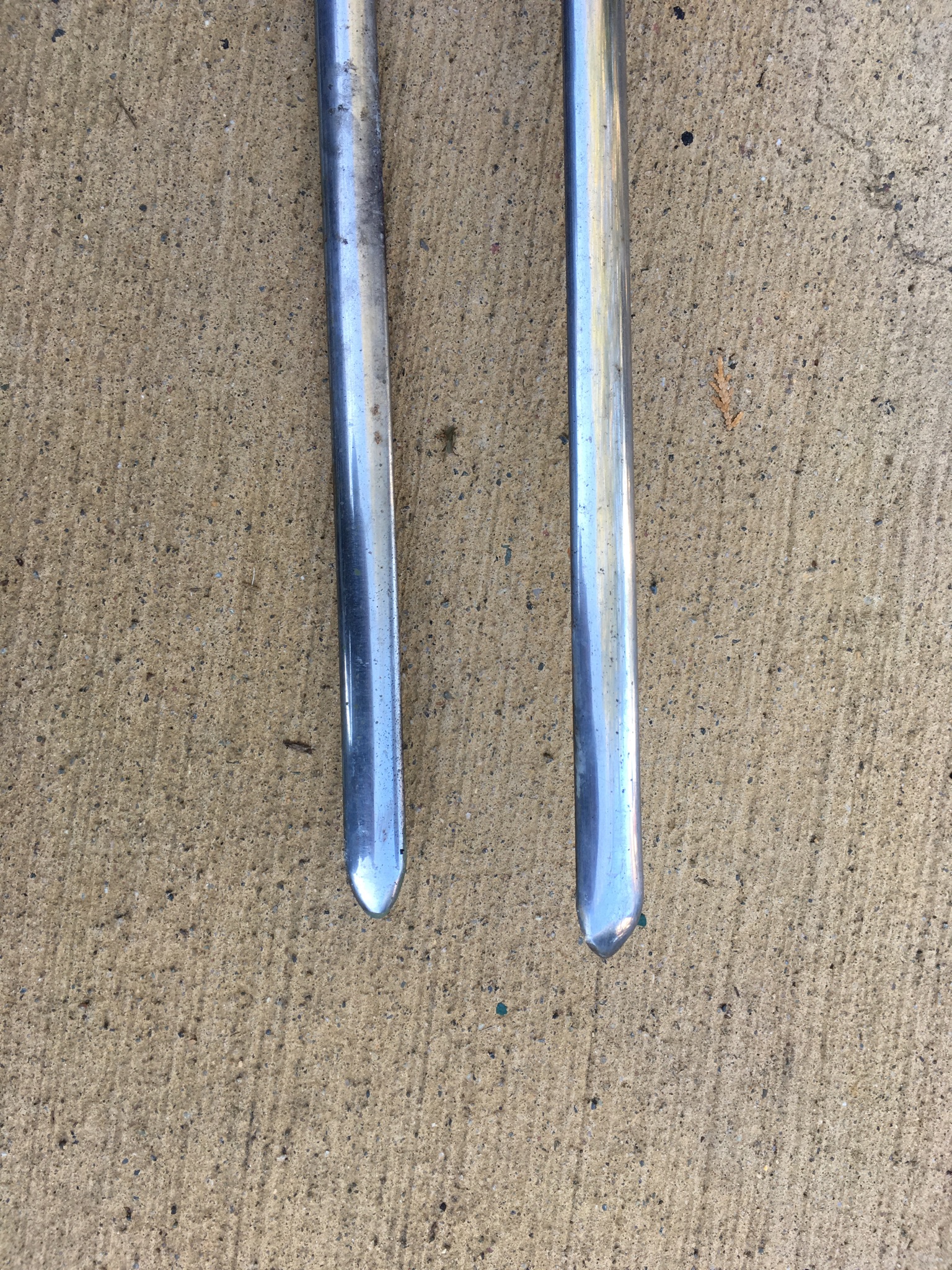 Mine are severely dented on both sides, probably from hitting curbs. They are 88"-90" long and about 7/8" wide.