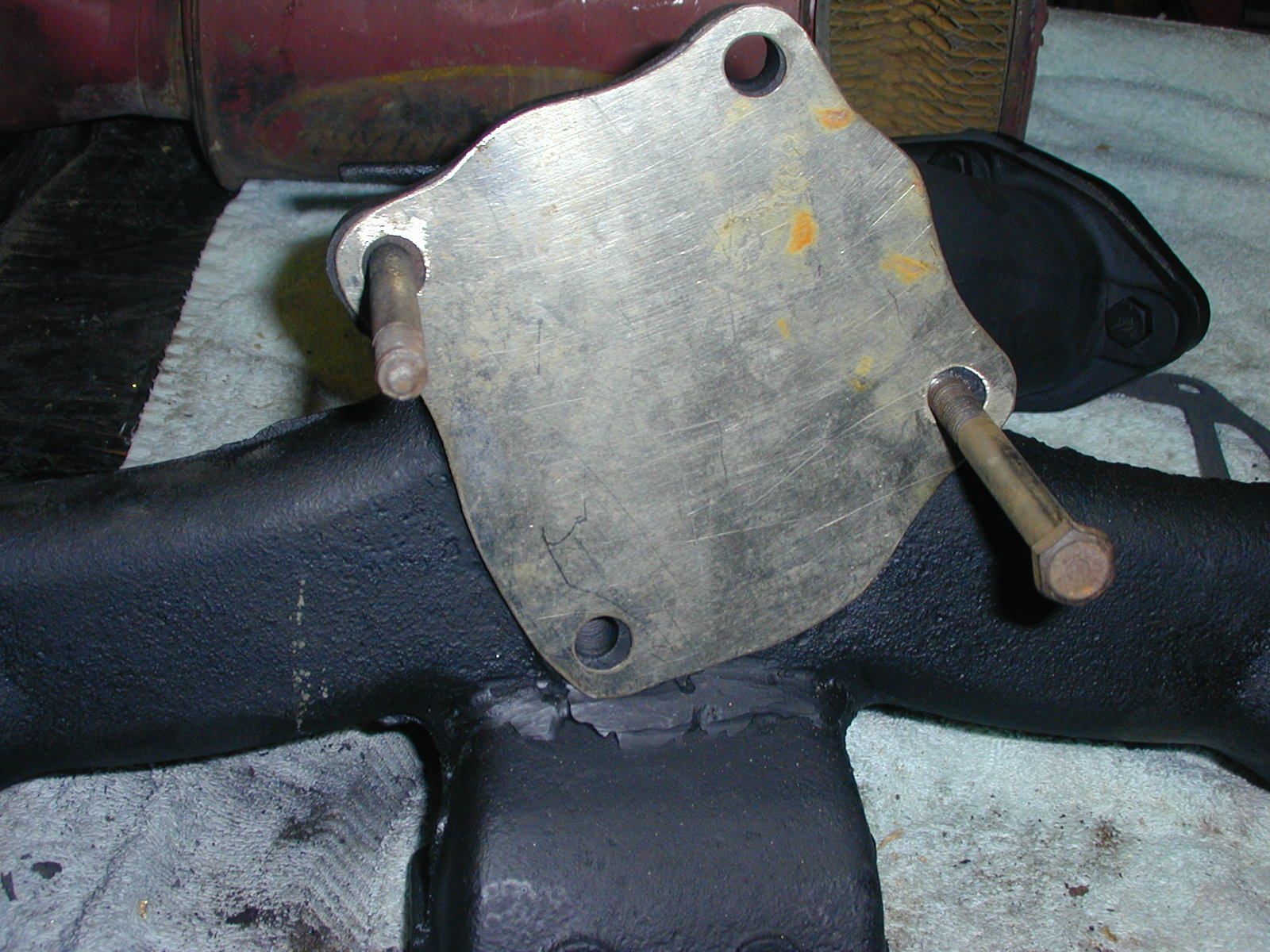 I had to replace one stud with a bolt due to the lack of room to start a nut on the stud with the adapter in place. just drilled the threads out of the original manifold and dropped a bolt in.  I also made a stainless shield to keep the exhaust out of the intake. I also removed the heat riser flapper and filled the holes with a couple short bolts. Adapter flange is at the welding shop. I decided to let the pro do the welding. I am going to use 1 7/8 exhaust pipe. It's only a 262 so I don't think dropping 1/8 ' is going to make any significant difference. I am going for the "sound" not performance. Maybe snakeing 1 7/8 pipe through the cross members will be a little easier than 2". Any suggestions on muffler choices? It's a '49 so has more room next to the fuel tank than the 51 and newer.