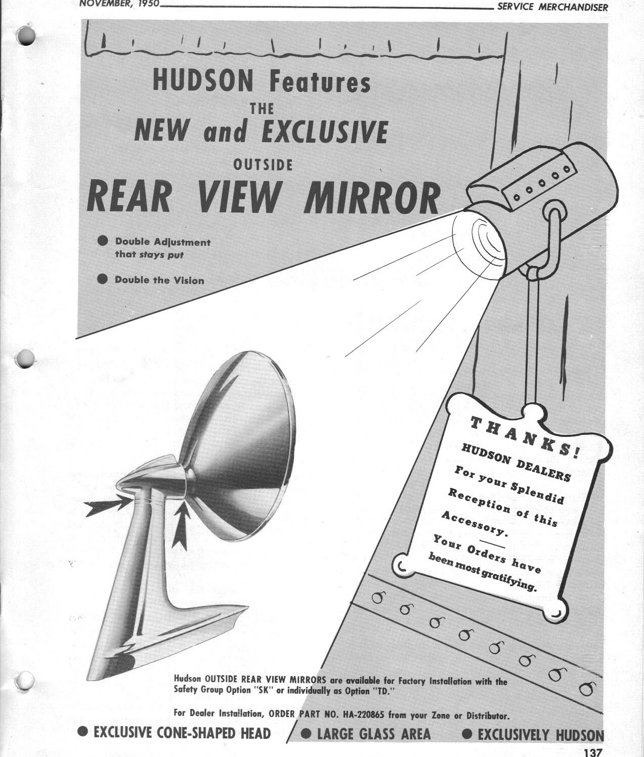 An image of that same outside rearview mirror is shown in the "Hudson Custom Tailored Accessories" flyer which is dated 10-53. If you hadn't checked already, Dale Cooper also sells an outsider rearview mirror that's suppose to be appropriate for stepdowns.0