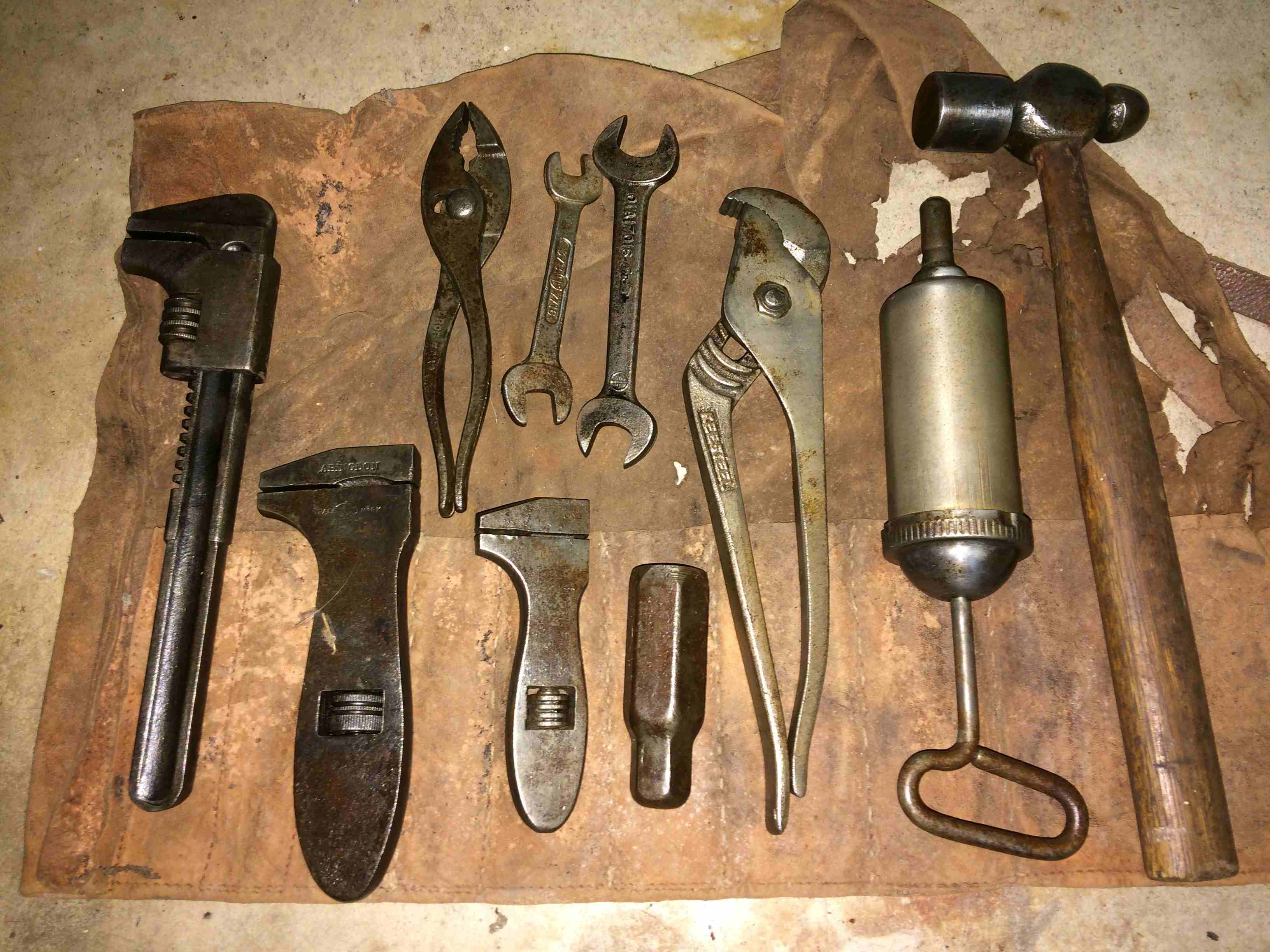 Here are the contents on what's left of the leather roll. I think the 2 smaller wrenches, the plug socket and grease gun were original. Don't know about the rest as I cant remember. Keep posting if you come up with any further info.0