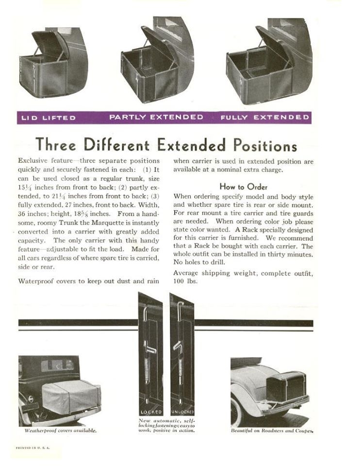 Greetings, HET fans, I was raised restoring old Fords, mostly Model As, but we did build one Model B roadster. Now I am passing the tradition down to my son by helping him build his first car. We are heavily modifying a VW based Gazelle Mercedes SSK replica roadster that he found on line. My first car was a 68 bug that my dad and I restored and I always wanted to build a kit car. Long story short, we were looking for an old 20s-30s removable trunk to serve as an engine cover. I found one and took a chance on it, but it turned out to be too nice. The restorer in me won't let me just chop it up without first determining if it might be that one rare piece that some enthusiast is hoping to find. I did a quick online search and found out that this Marquette Hiway King was a dealership option on Hudson and Essex in the 1930-33 range. WhenI picked it up (some nitwit had drilled through the sides and attached cheap door pulls) I noticed that it was a lot heavier than other similar trunks I've seen. Reading the literature I found online, it turns out that is because the whole front, bottom and sides are doubled up so that once the lid is opened, the whole front slides out and the trunk doubles it's capacity. Pretty nifty. Does anyone have an idea if these were exclusive to the HET marques? Also, what is the rarity/approximate value of this model? I apologize if that breaks any forum etiquette, but I would prefer to find something else for our project and save this piece for folks who own real collector cars.