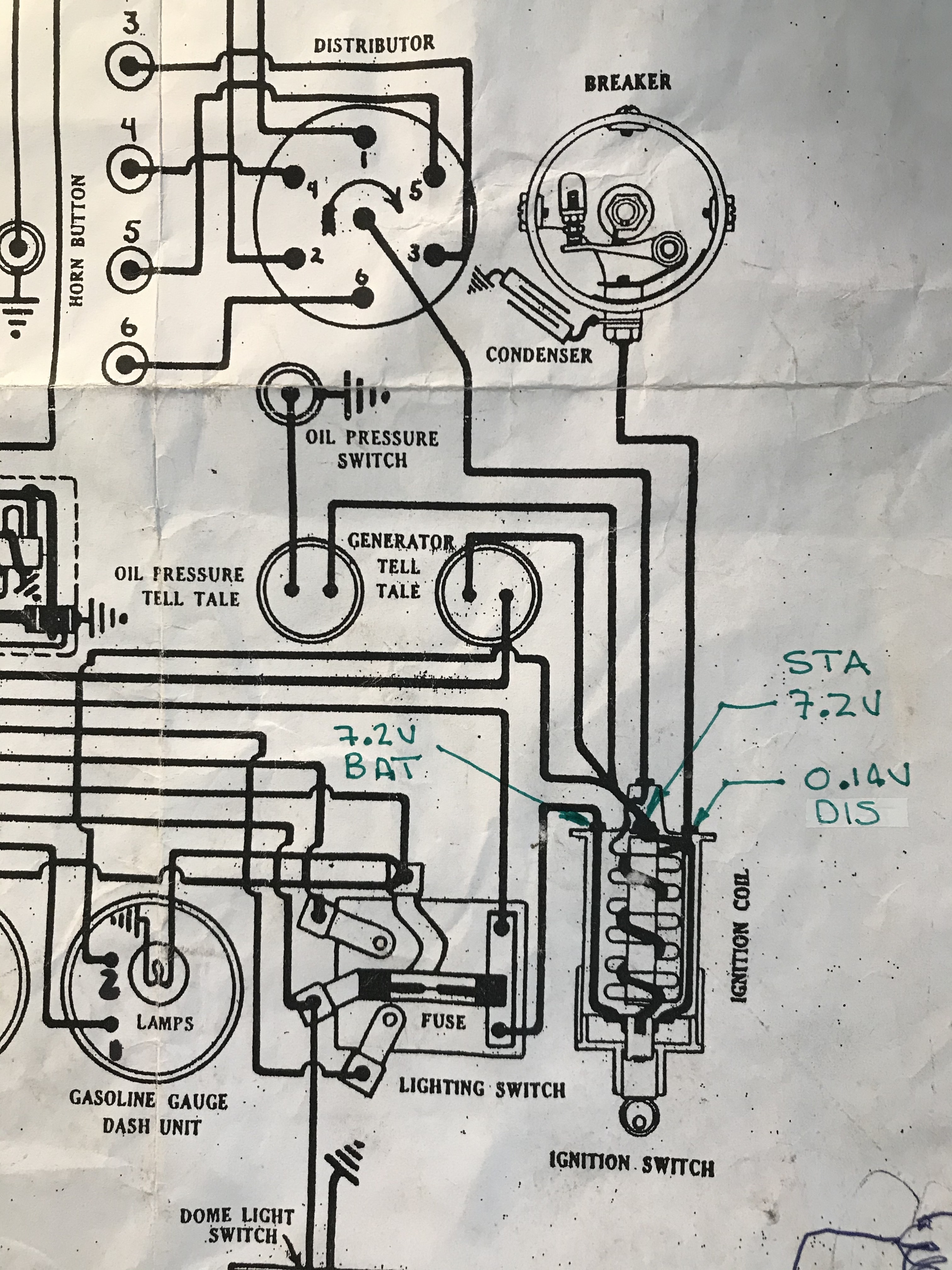 All the lights and the horn work fine. The oil pressure and amp warning lights work when the key is turned ON. The car turns over fine. Problem is no spark. Tested the coil per Geoff's reply in kamzack's 6 Volt Coil post, no spark. Attached markup shows the voltage readings we get with the key in the ON position. The reading at the BAT terminal is the same 7.2V with the key either ON or OFF which would seam correct. Does the 0.14V reading at the DIS terminal seam correct?