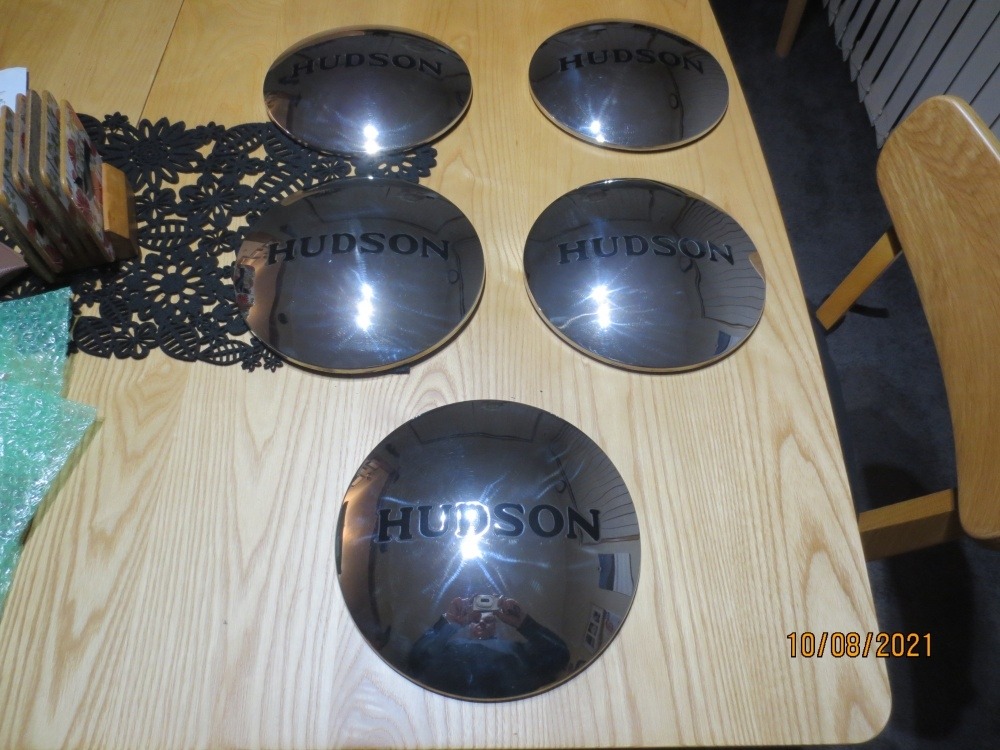 1935 Hudson 8 coupe Hub caps Received my newly covered 35 Hudson caps today Fabulous job