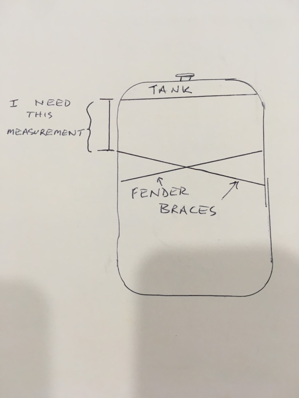 In front of the radiator, are 2 crossed fender braces. I need a measurement from the bottom of the tank to the fender brace.