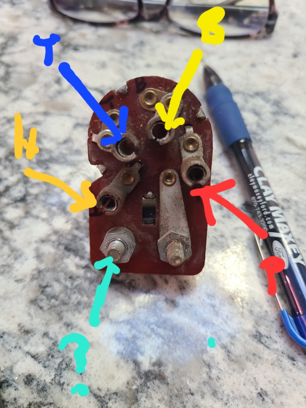 The stud terminal marked in the picture in teal appears to be lighter, clock, and main circuit breaker (bat side).